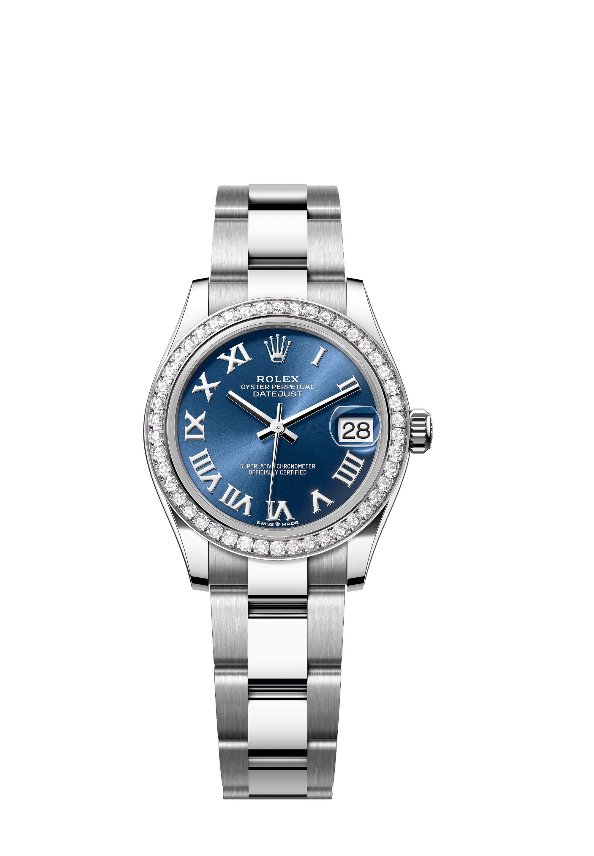 This Oyster Perpetual Datejust 31 in Oystersteel and white gold features a bright blue dial and an Oyster bracelet.