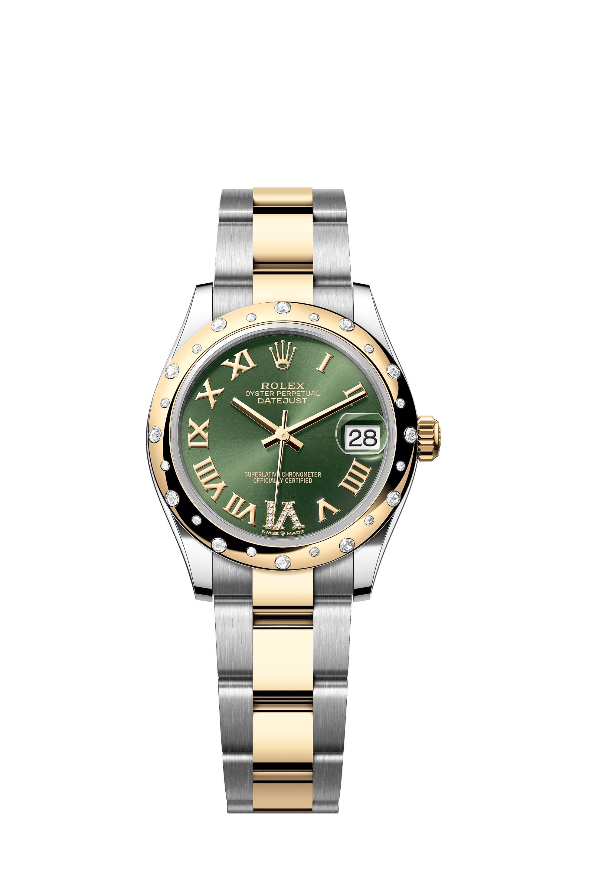 This Oyster Perpetual Datejust 31 in Oystersteel and yellow gold features an olive-green, diamond-set dial and an Oyster bracelet.