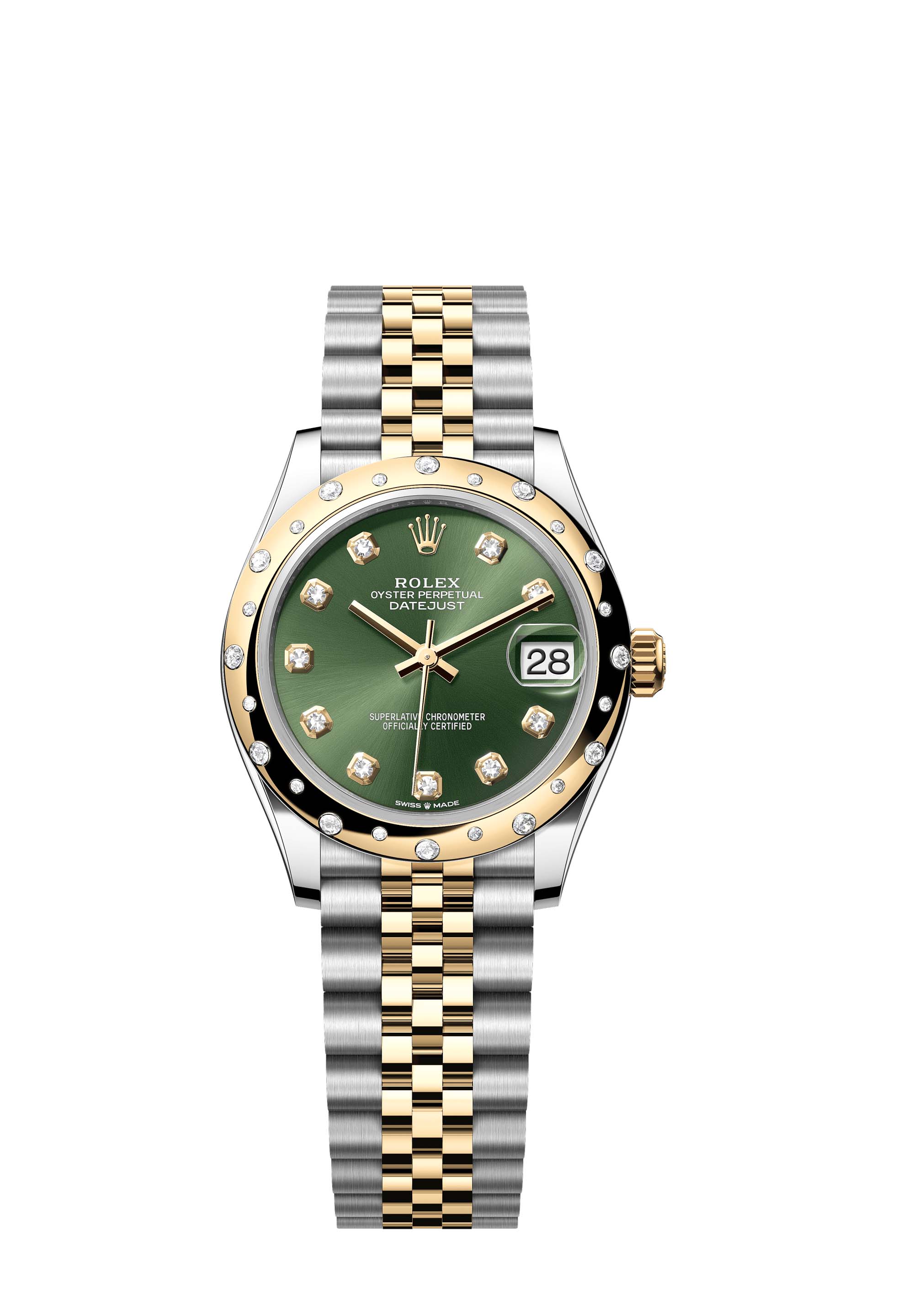 This Oyster Perpetual Datejust 31 in Oystersteel and yellow gold features an olive-green, diamond-set dial and a Jubilee bracelet.