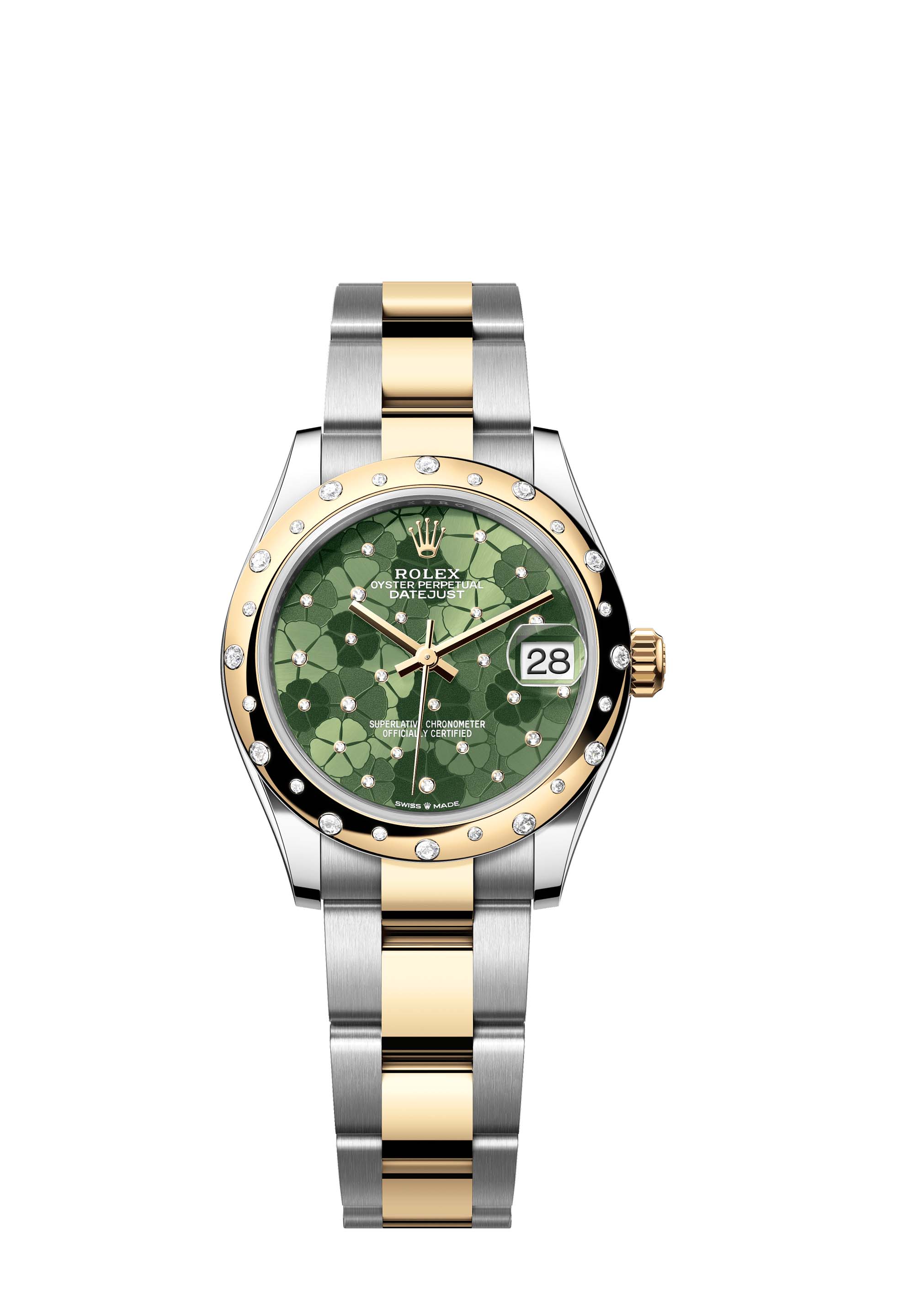 This Oyster Perpetual Datejust 31 in Oystersteel and yellow gold features an olive-green floral-motif, diamond-set dial and an Oyster bracelet.