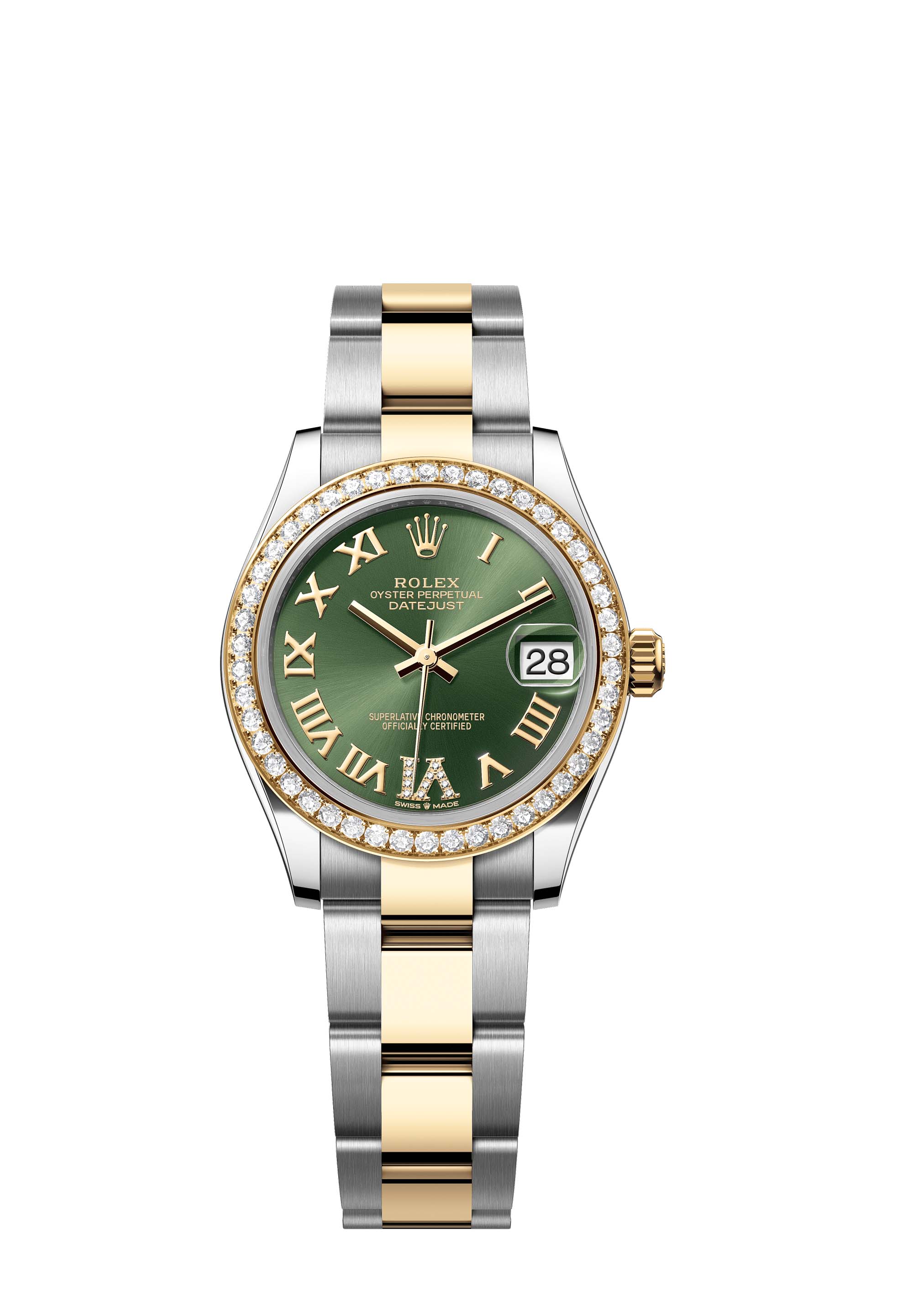 This Oyster Perpetual Datejust 31 in Oystersteel and yellow gold features an olive-green, diamond-set dial and an Oyster bracelet.