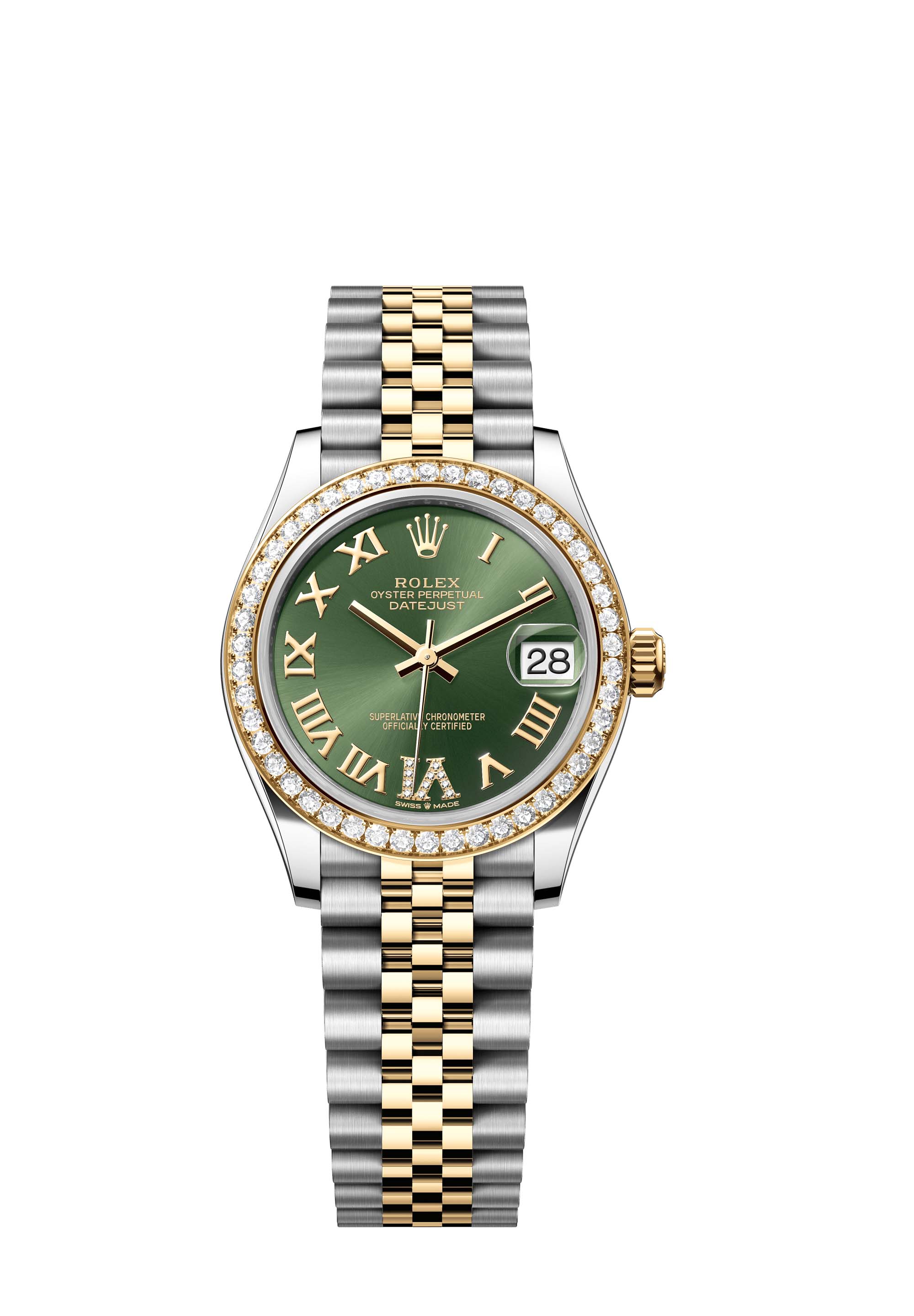 This Oyster Perpetual Datejust 31 in Oystersteel and yellow gold features an olive-green, diamond-set dial and a Jubilee bracelet.