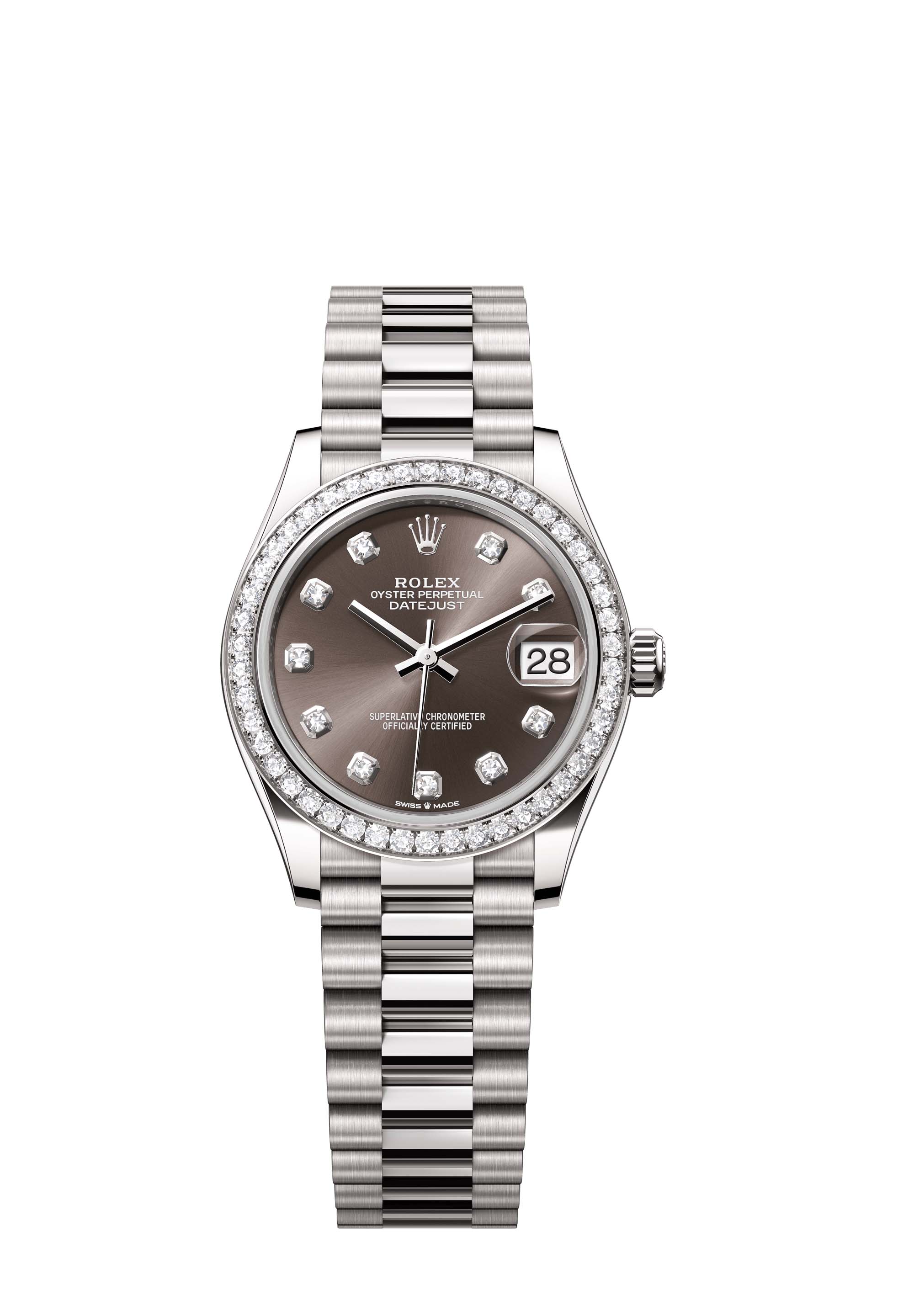 This Oyster Perpetual Datejust 31 in 18 ct white gold features a dark grey, diamond-set dial and a President bracelet.