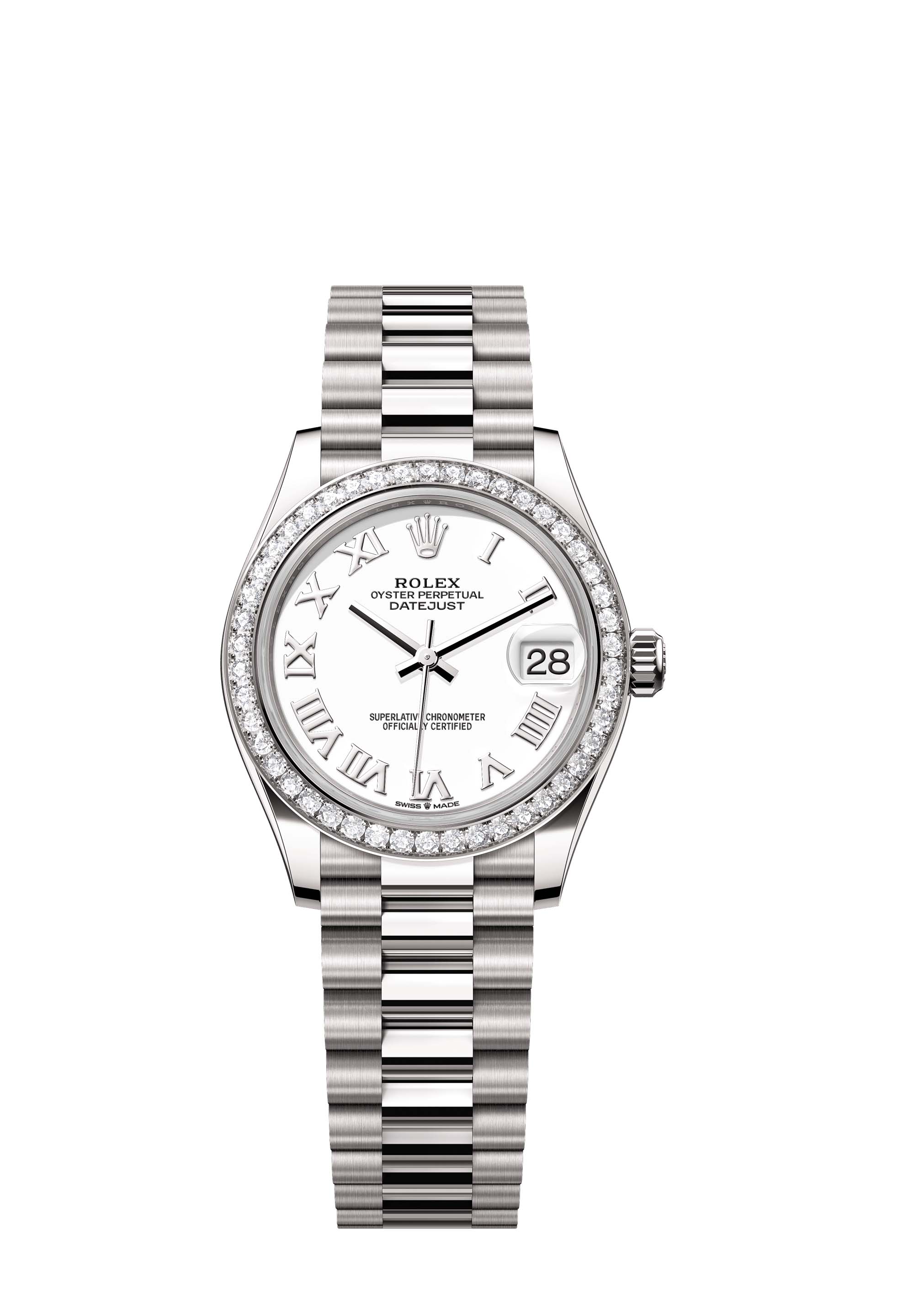 This Oyster Perpetual Datejust 31 in 18 ct white gold features a white dial and a President bracelet.