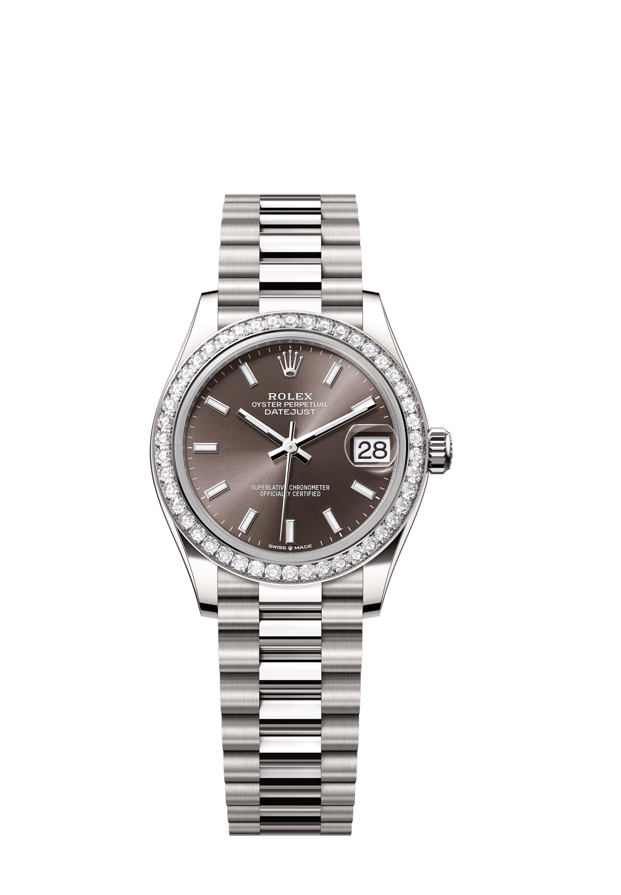This Oyster Perpetual Datejust 31 in 18 ct white gold features a dark grey dial and a President bracelet.