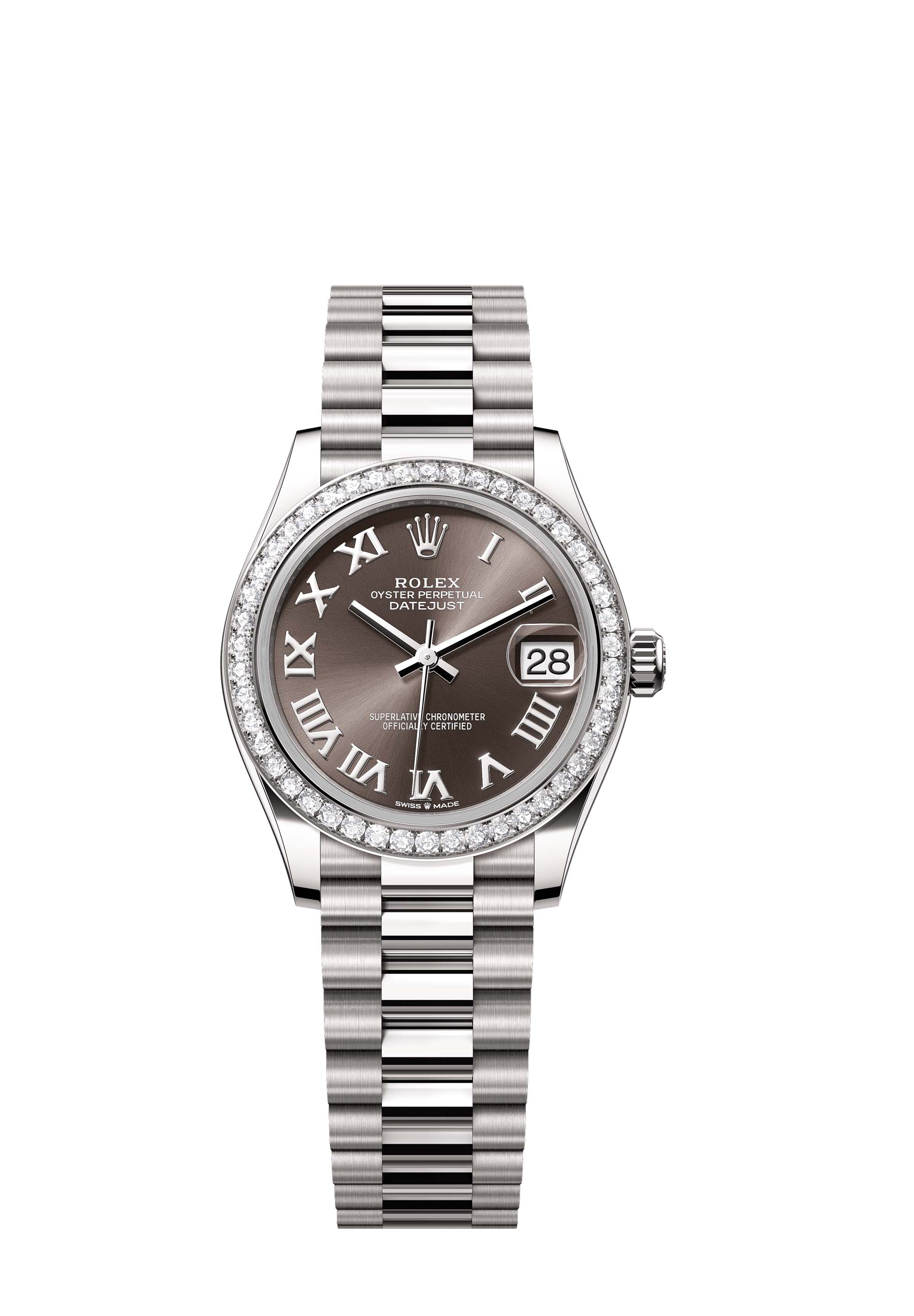 This Oyster Perpetual Datejust 31 in 18 ct white gold features a dark grey dial and a President bracelet.