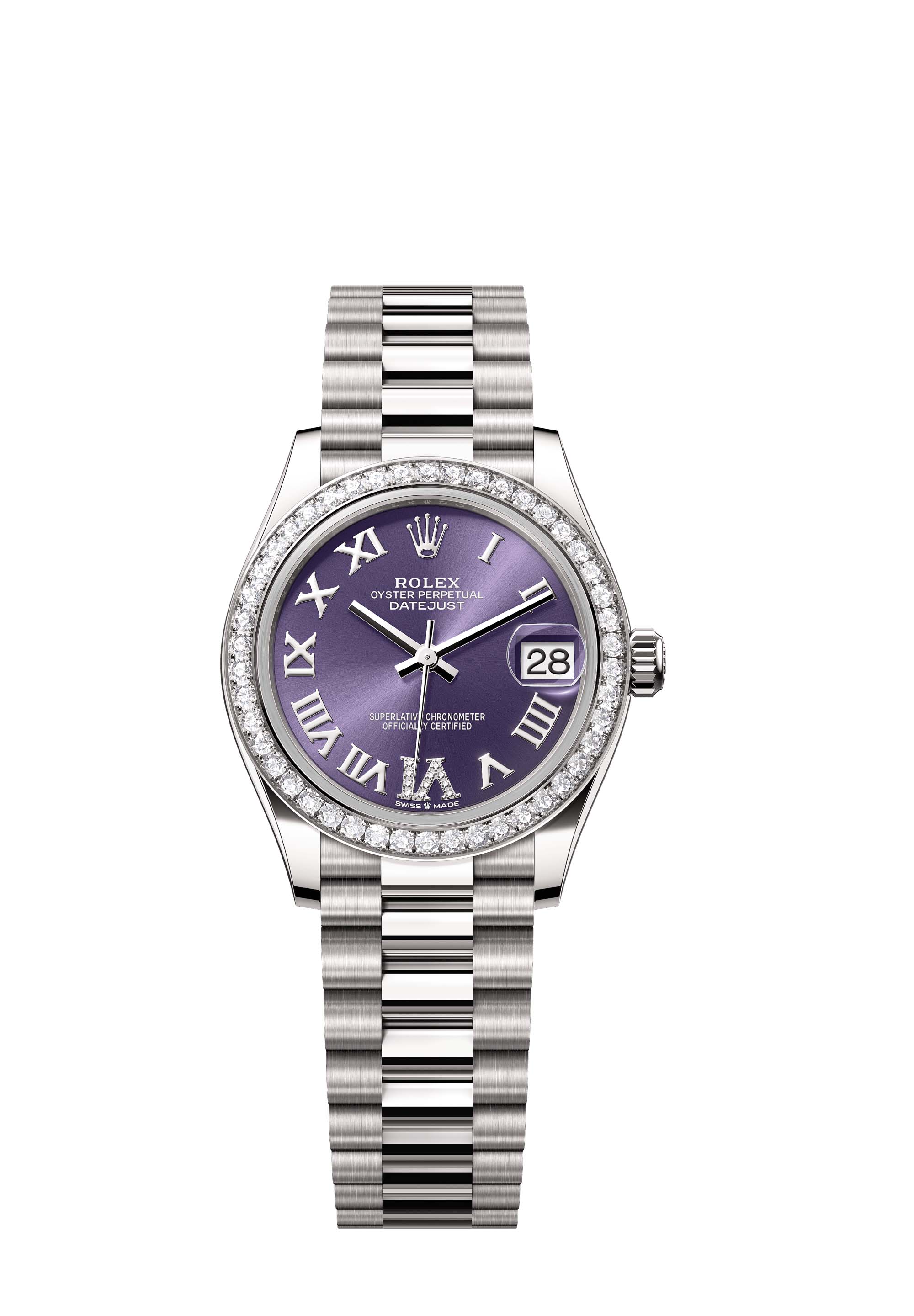 This Oyster Perpetual Datejust 31 in 18 ct white gold features an aubergine, diamond-set dial and a President bracelet.