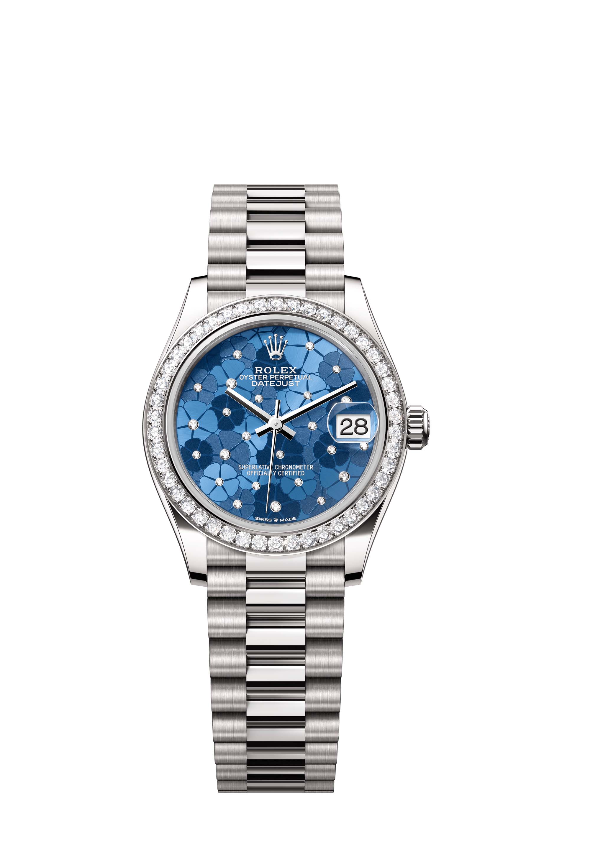 This Oyster Perpetual Datejust 31 in 18 ct white gold features an azzurro-blue floral-motif, diamond-set dial and a President bracelet.