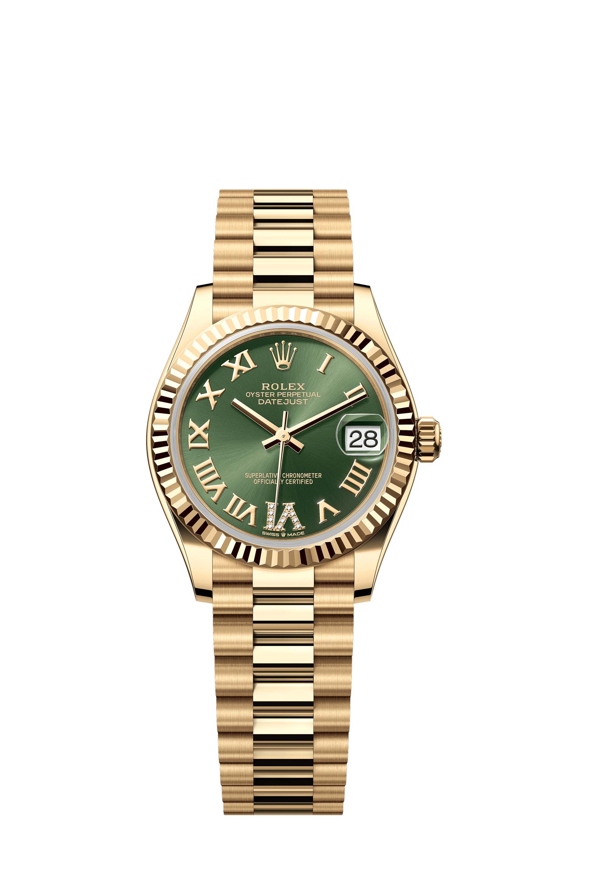 This Oyster Perpetual Datejust 31 in 18 ct yellow gold features an olive-green, diamond-set dial and a President bracelet.