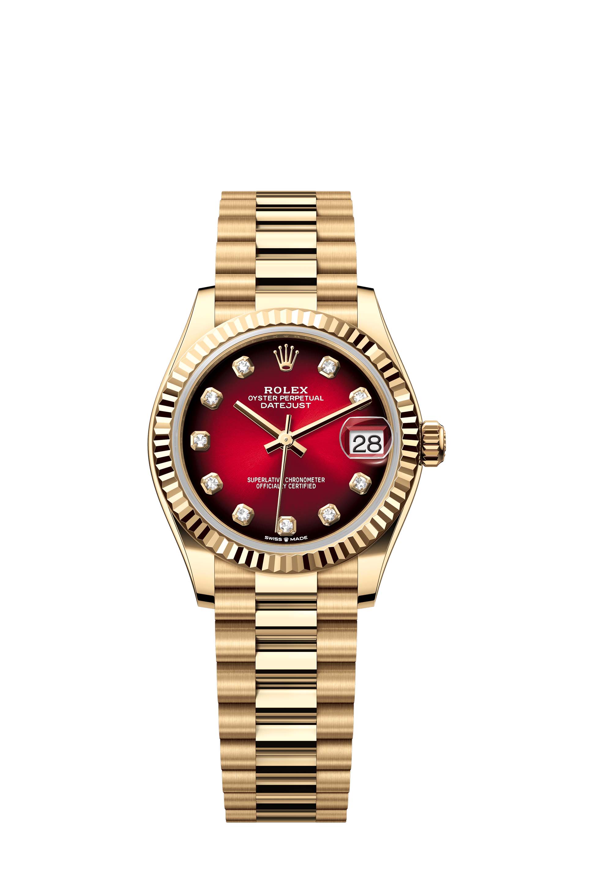 This Oyster Perpetual Datejust 31 in 18 ct yellow gold features a red ombré, diamond-set dial and a President bracelet.