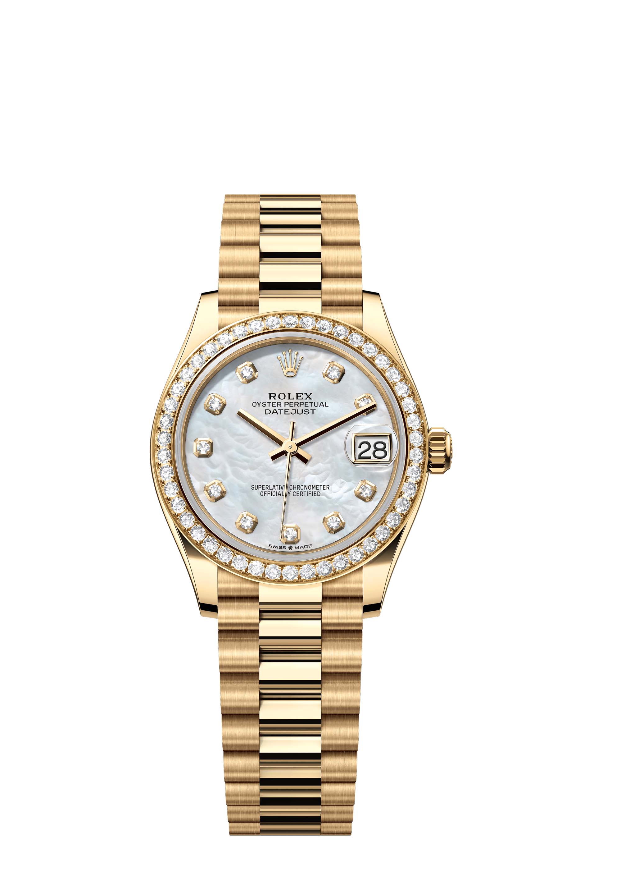 This Oyster Perpetual Datejust 31 in 18 ct yellow gold features a white mother-of-pearl, diamond-set dial and a President bracelet.