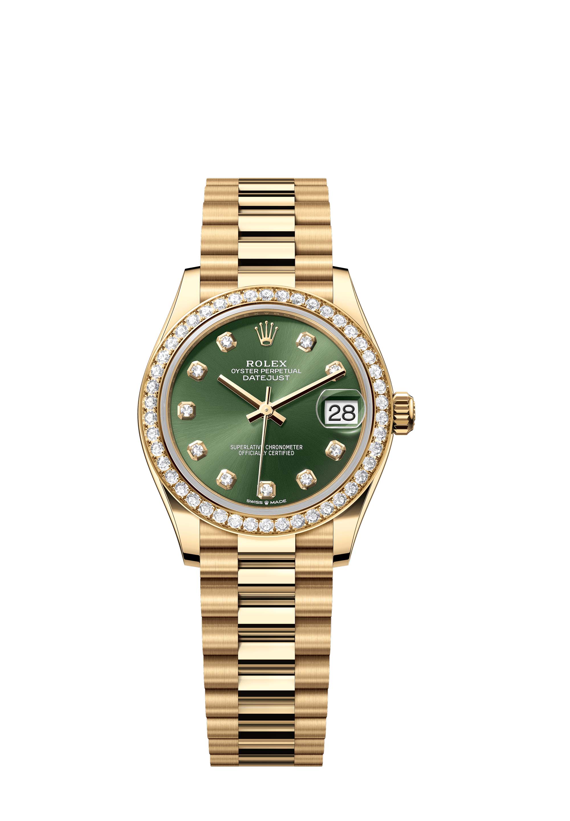 This Oyster Perpetual Datejust 31 in 18 ct yellow gold features an olive-green, diamond-set dial and a President bracelet.