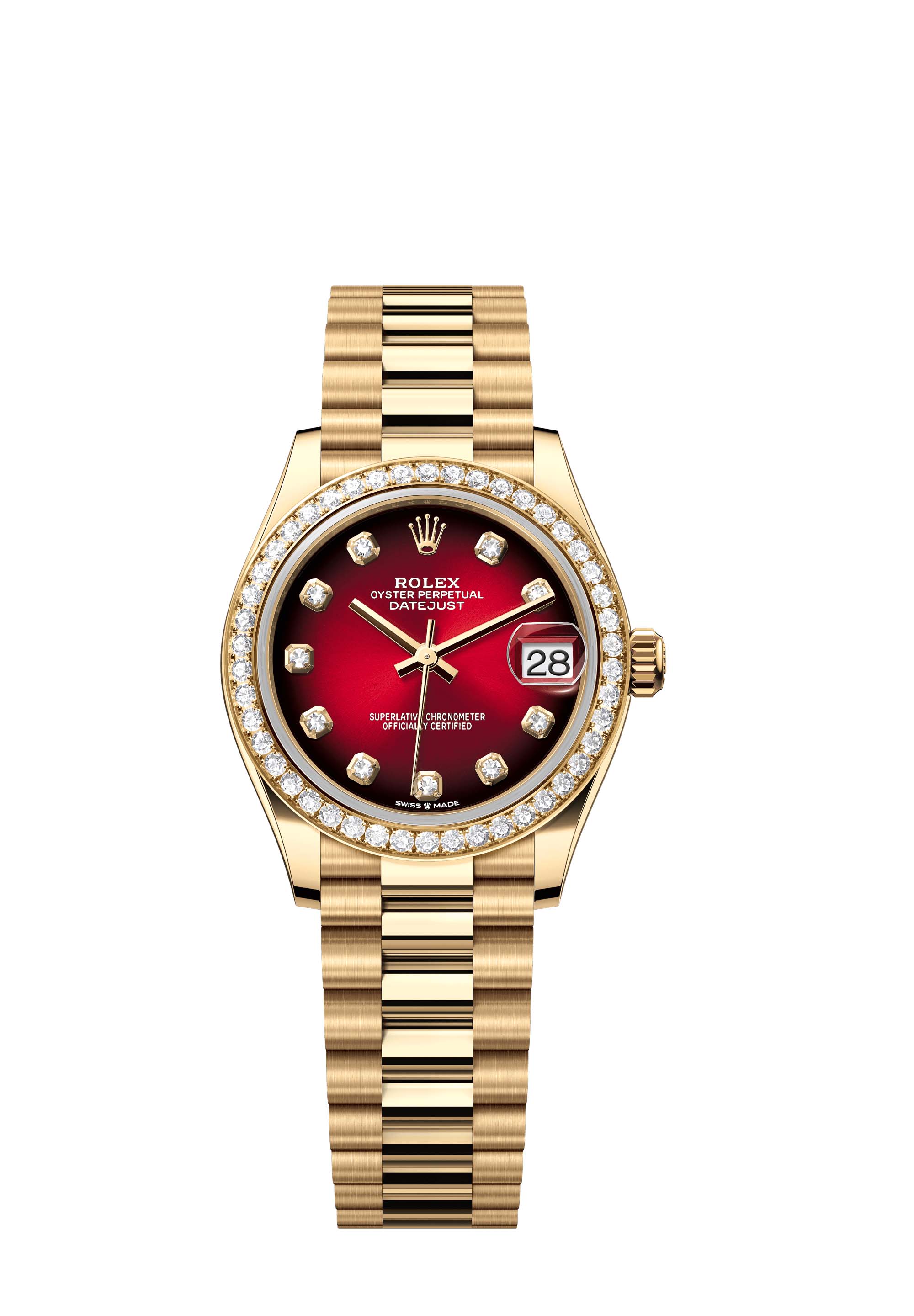This Oyster Perpetual Datejust 31 in 18 ct yellow gold features a red ombré, diamond-set dial and a President bracelet.