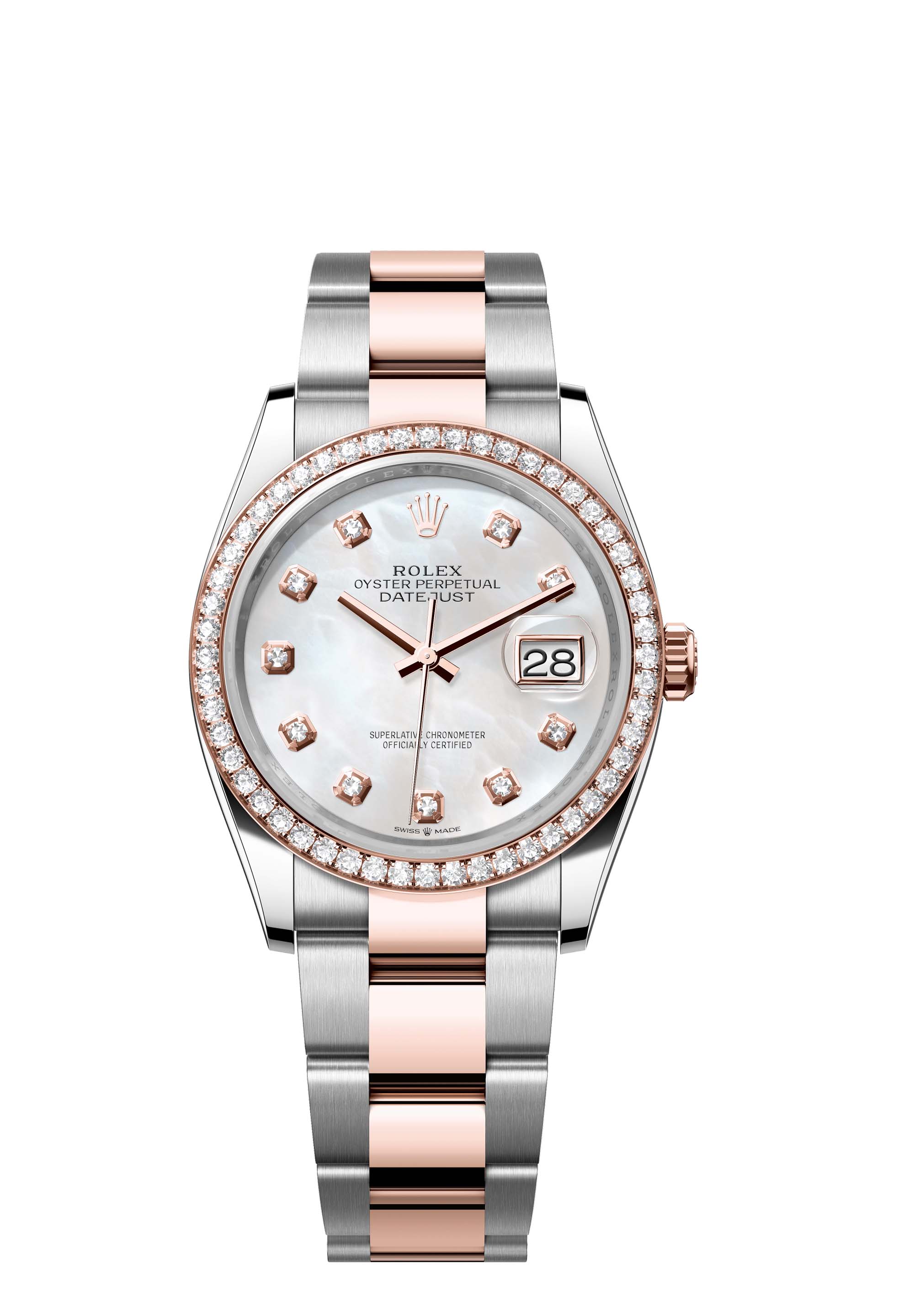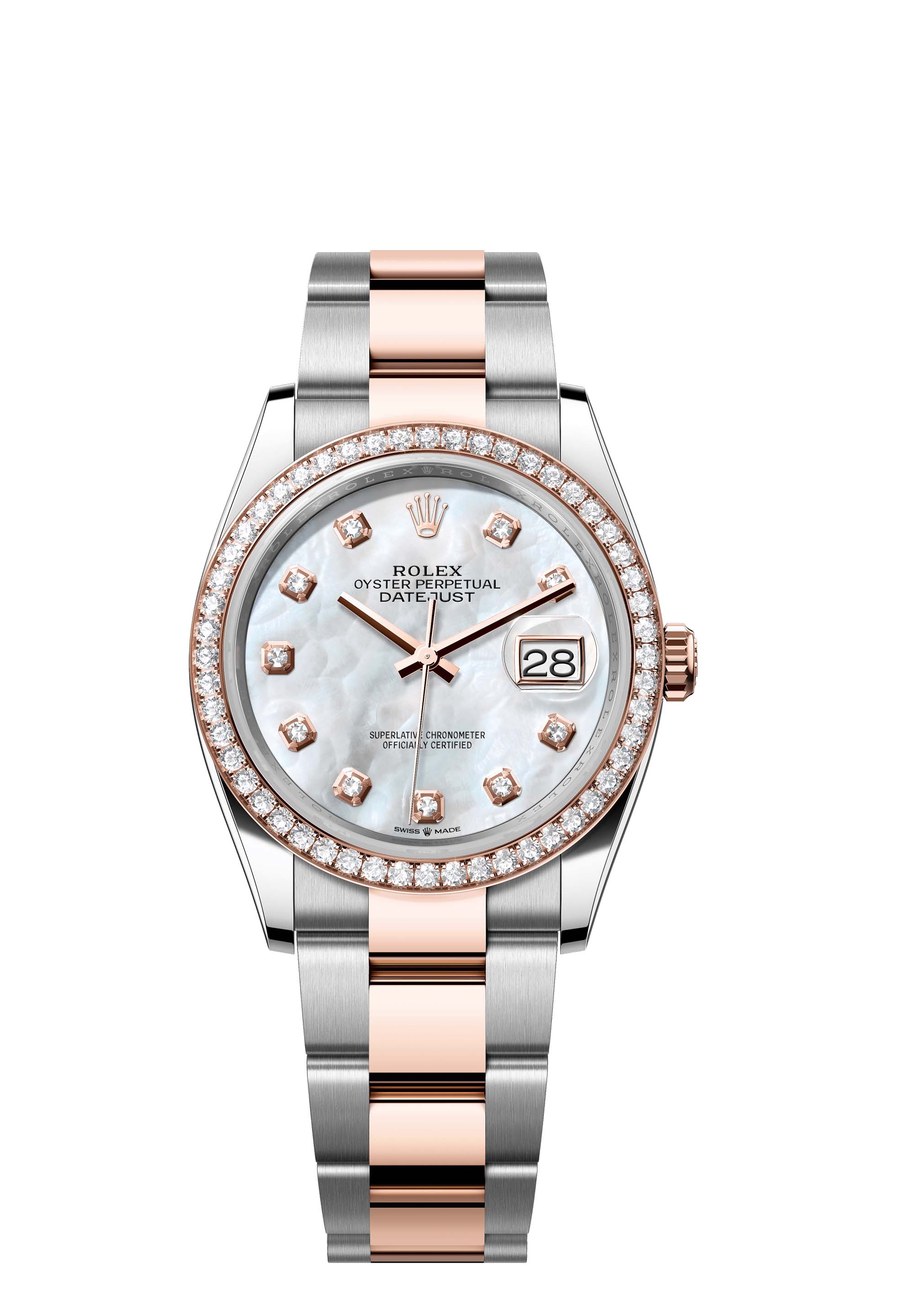 This Oyster Perpetual Datejust 36 in Oystersteel and Everose gold features a white mother-of-pearl, diamond-set dial and an Oyster bracelet.