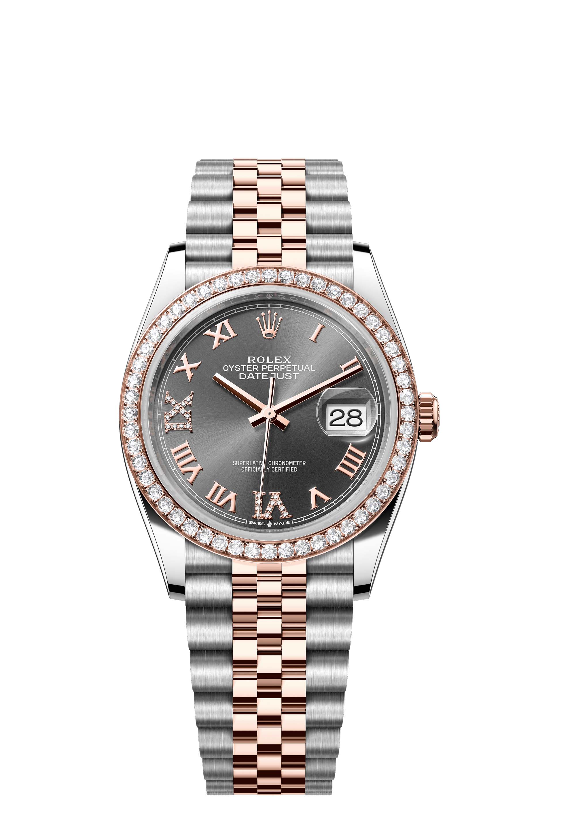 This Oyster Perpetual Datejust 36 in Oystersteel and Everose gold features a slate, diamond-set dial and a Jubilee bracelet.