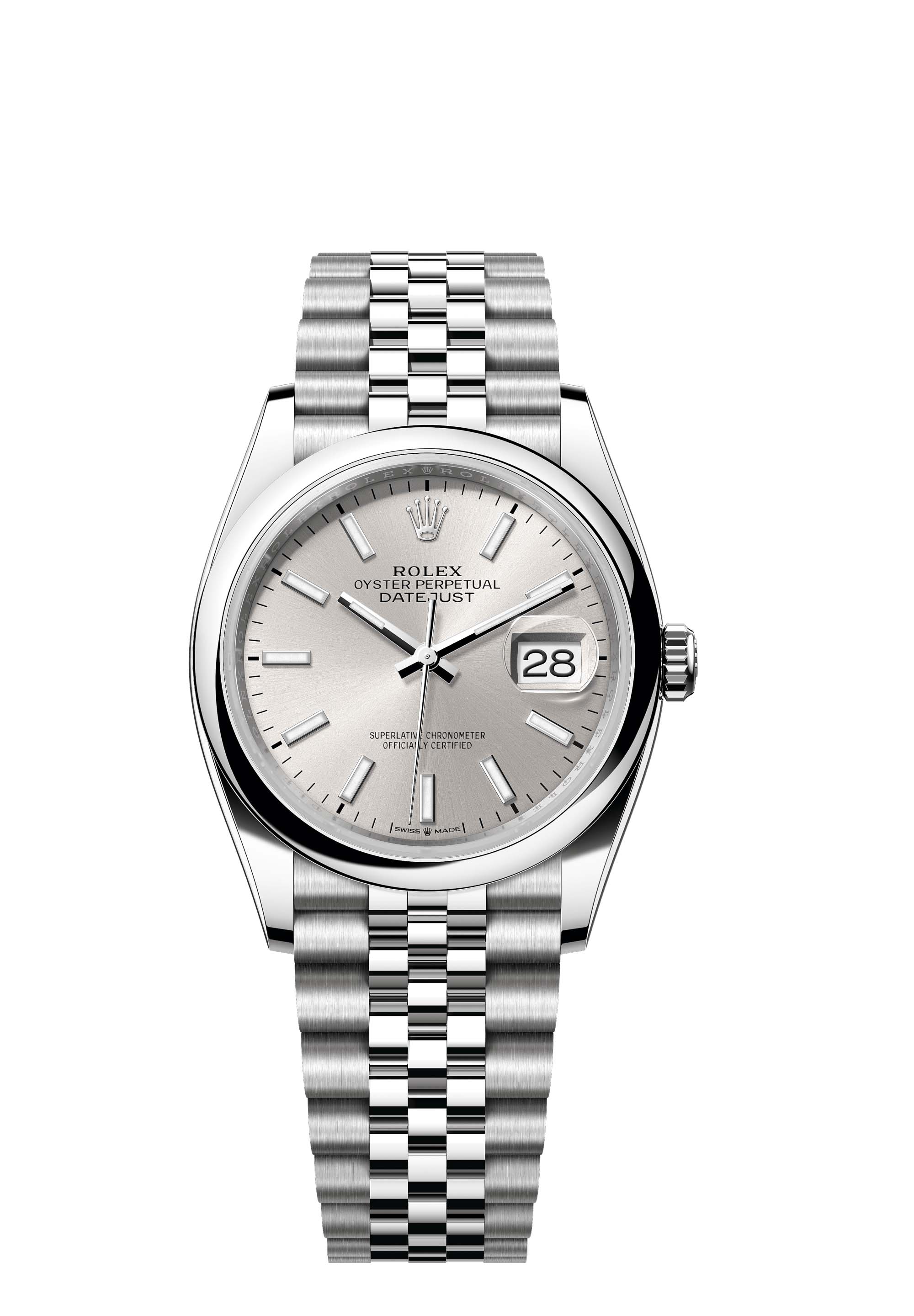 This Oyster Perpetual Datejust 36 in Oystersteel features a silver dial and a Jubilee bracelet.