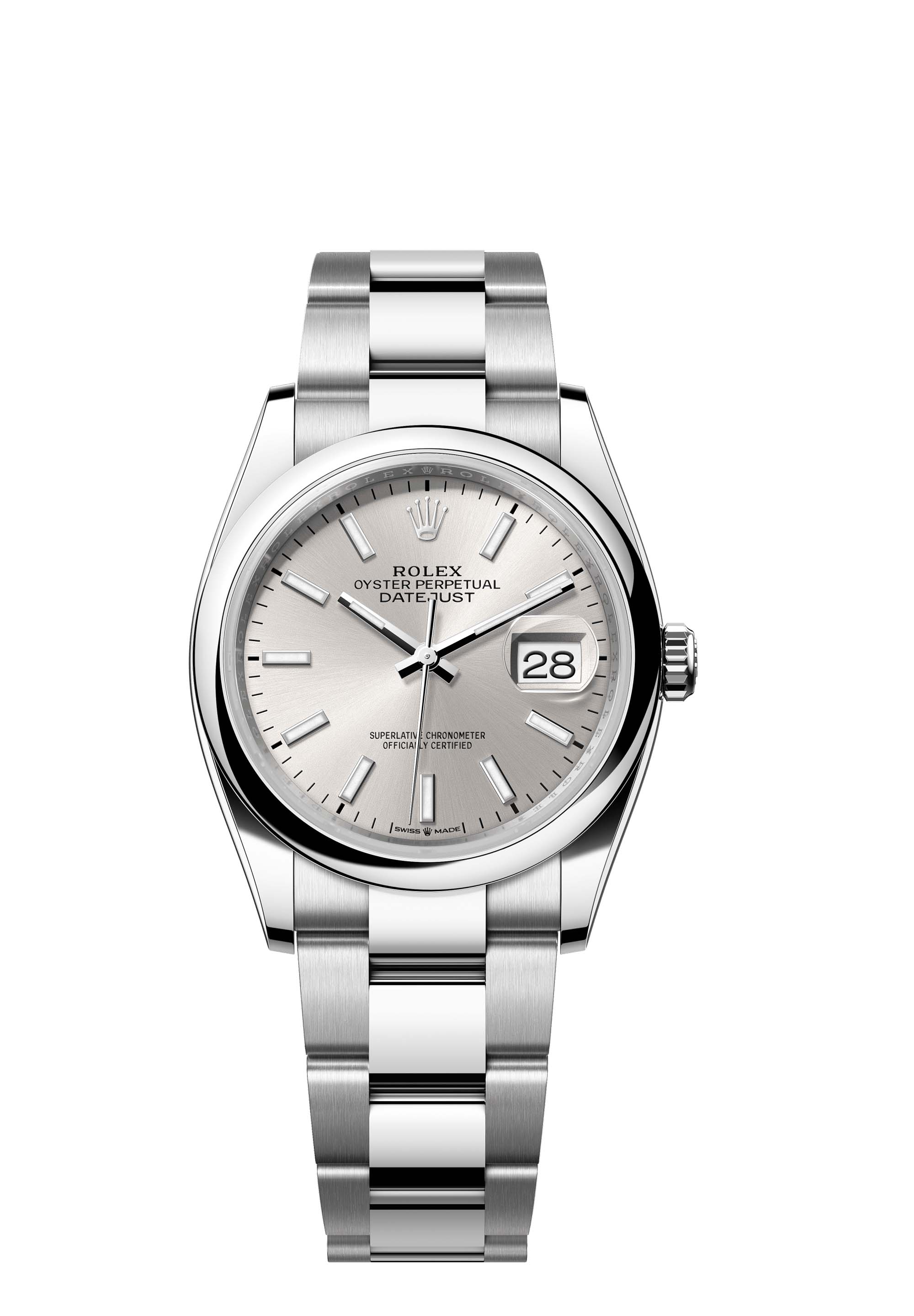 This Oyster Perpetual Datejust 36 in Oystersteel features a silver dial and an Oyster bracelet.