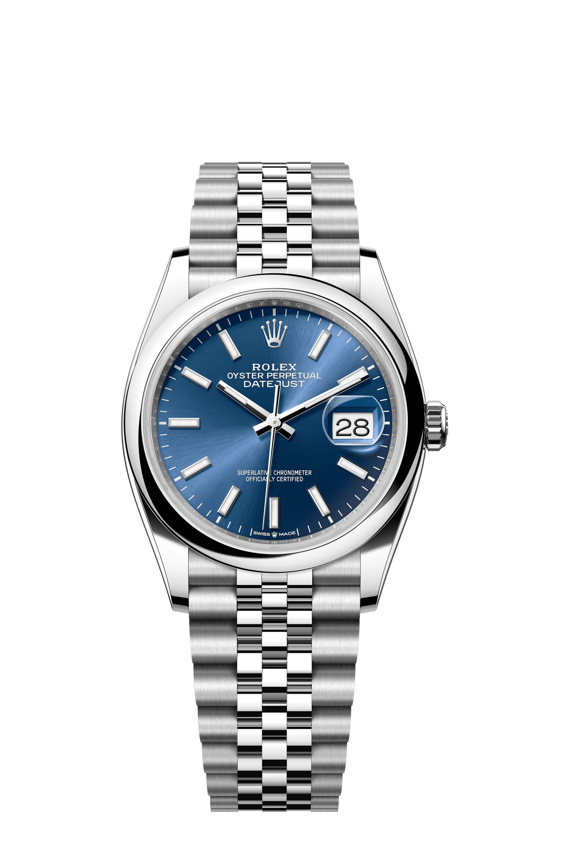 This Oyster Perpetual Datejust 36 in Oystersteel features a bright blue dial and a Jubilee bracelet.