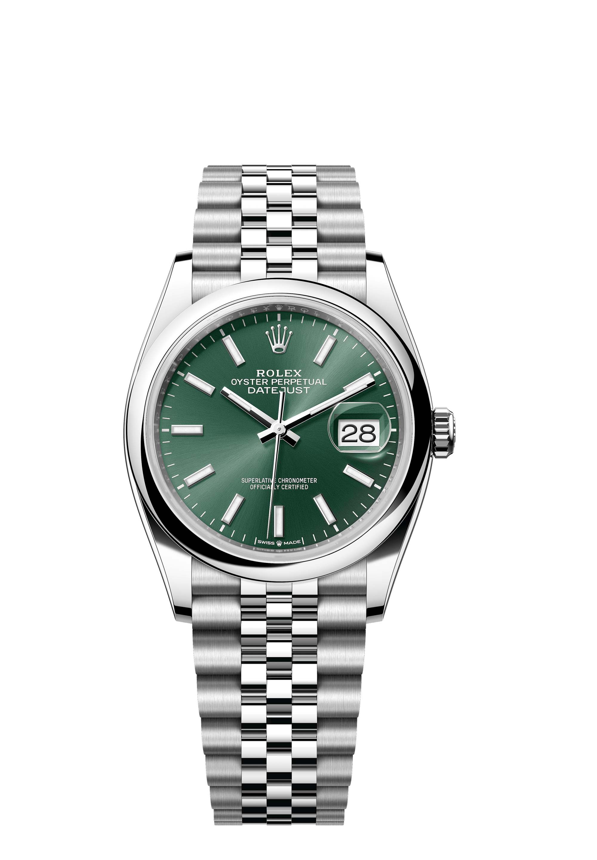 This Oyster Perpetual Datejust 36 in Oystersteel features a mint green dial and a Jubilee bracelet.
