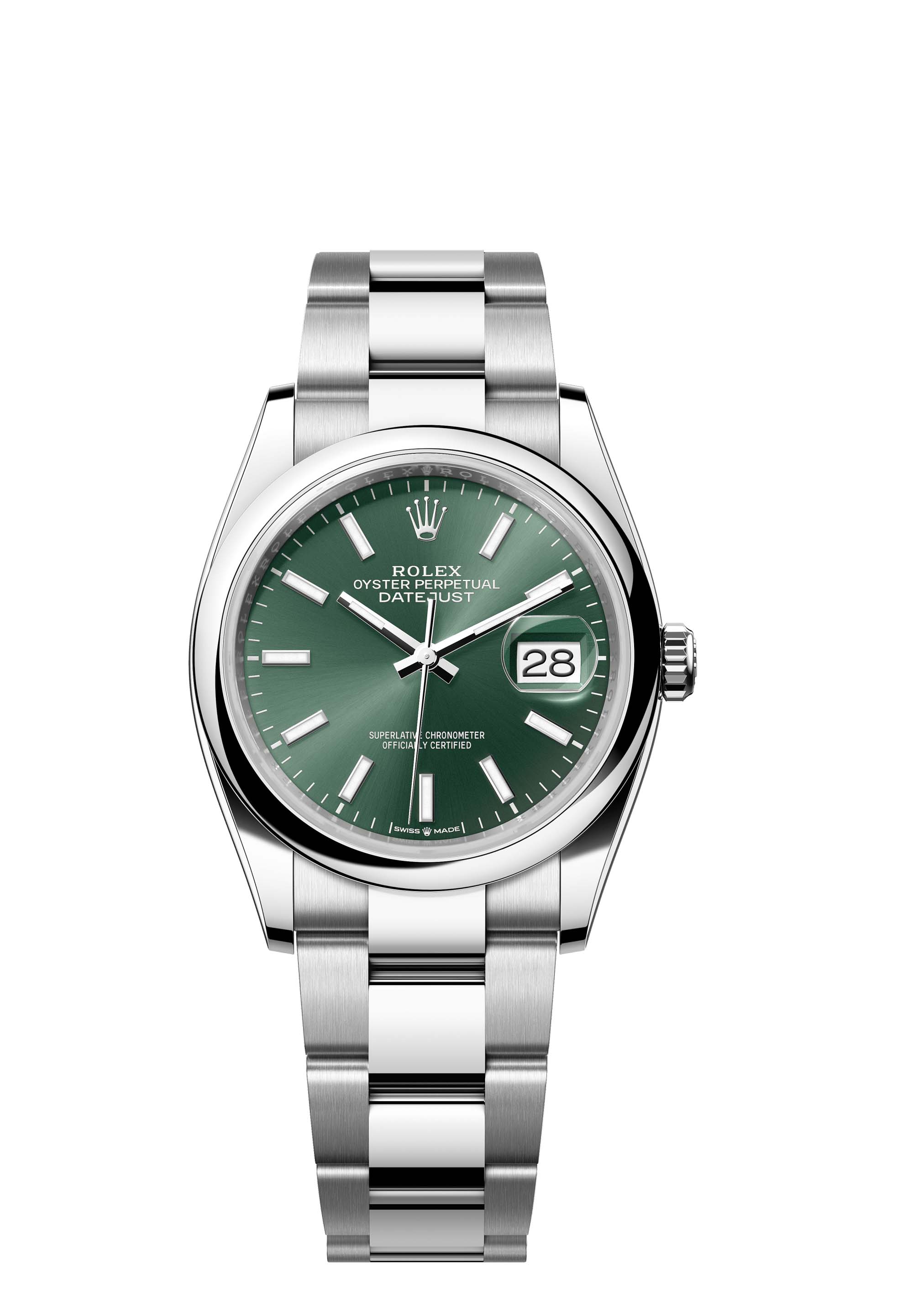 This Oyster Perpetual Datejust 36 in Oystersteel features a mint green dial and an Oyster bracelet.