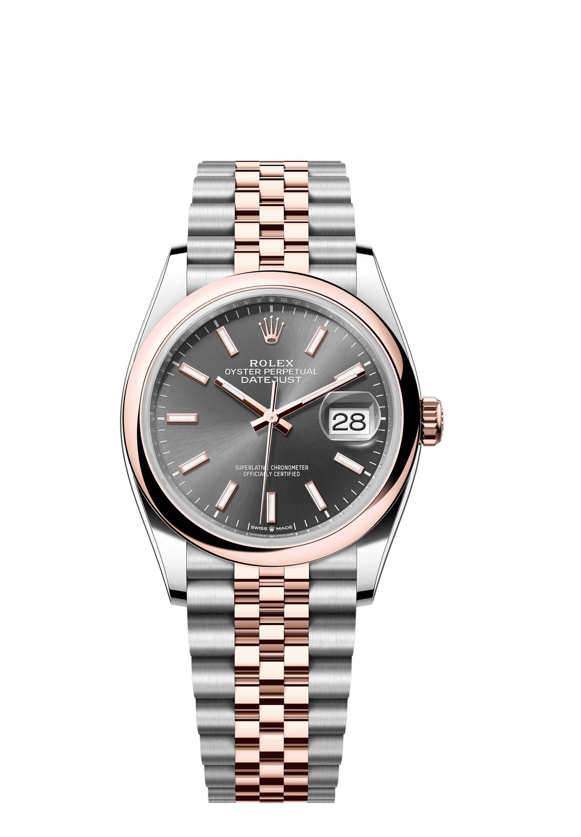 This Oyster Perpetual Datejust 36 in Oystersteel and Everose gold features a slate dial and a Jubilee bracelet.