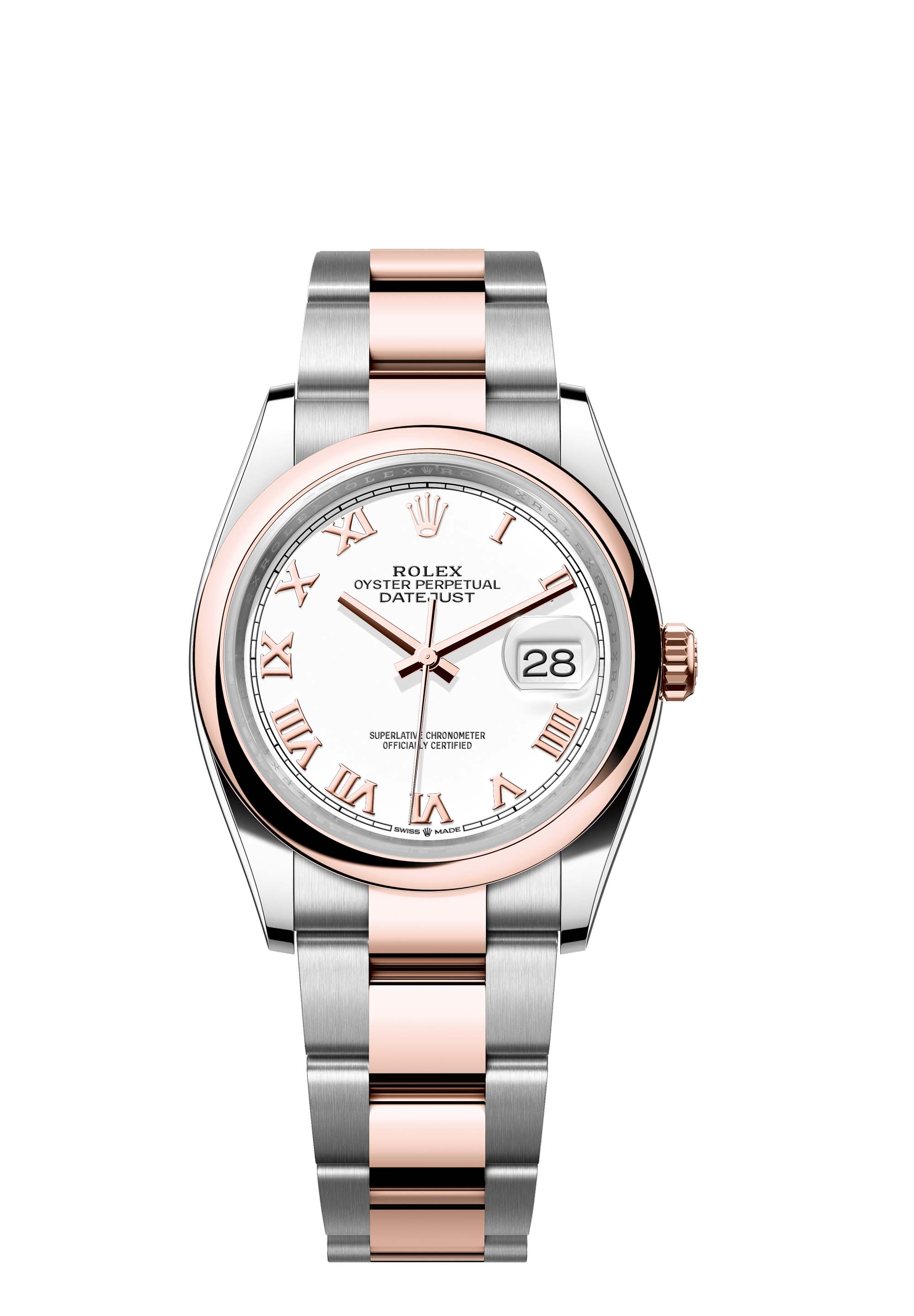 This Oyster Perpetual Datejust 36 in Oystersteel and Everose gold features a white dial and an Oyster bracelet.