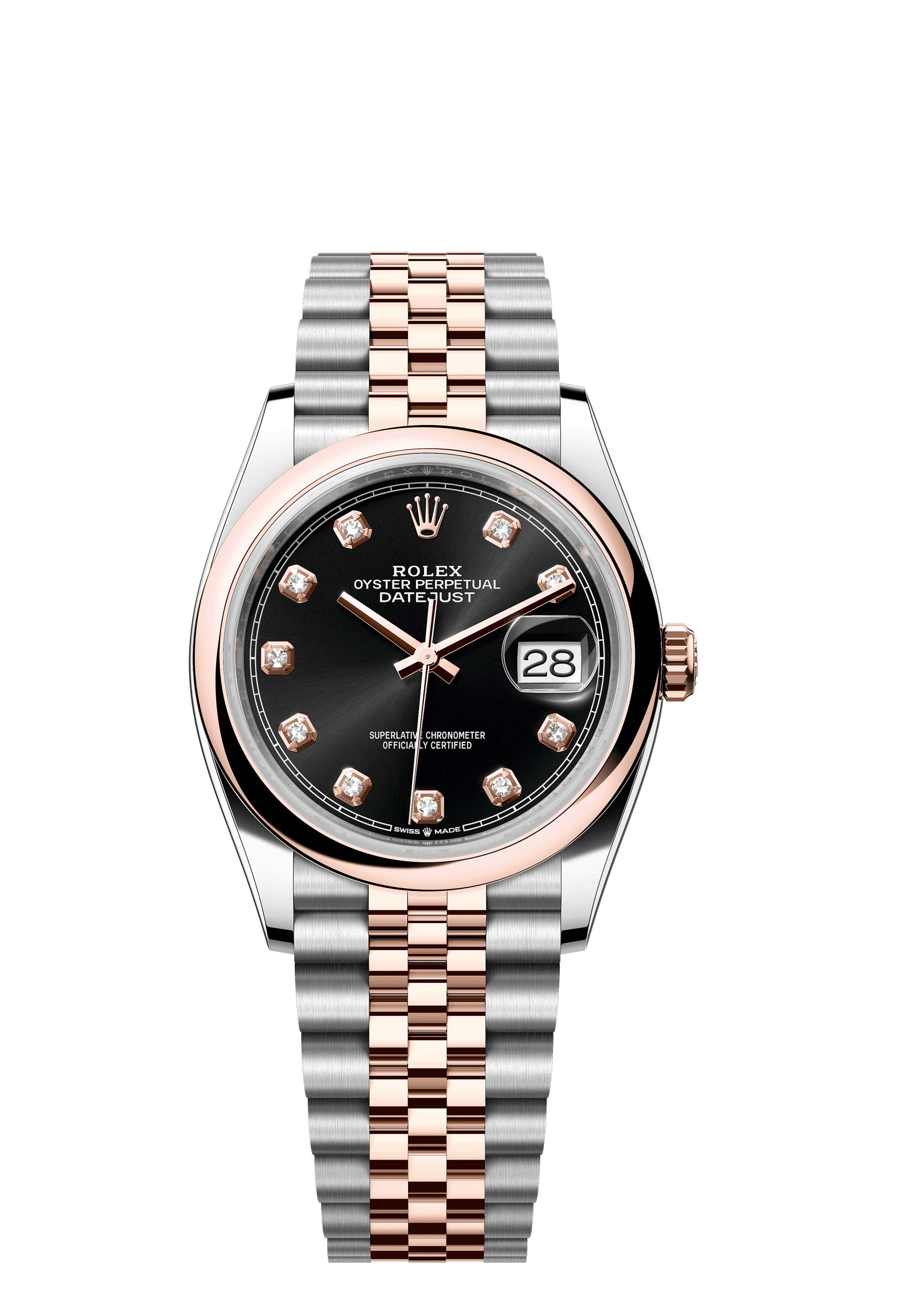 This Oyster Perpetual Datejust 36 in Oystersteel and Everose gold features a bright black, diamond-set dial and a Jubilee bracelet.