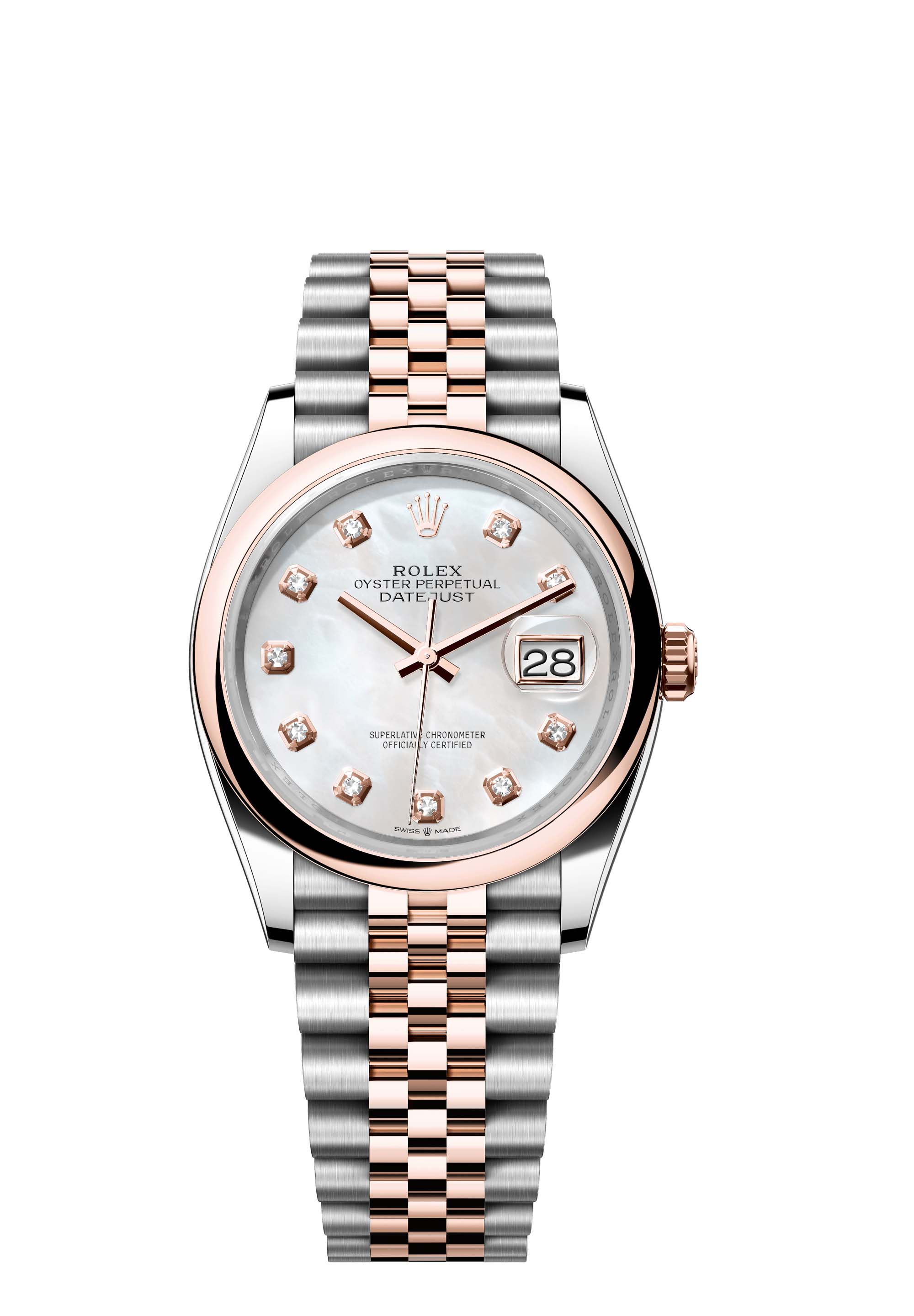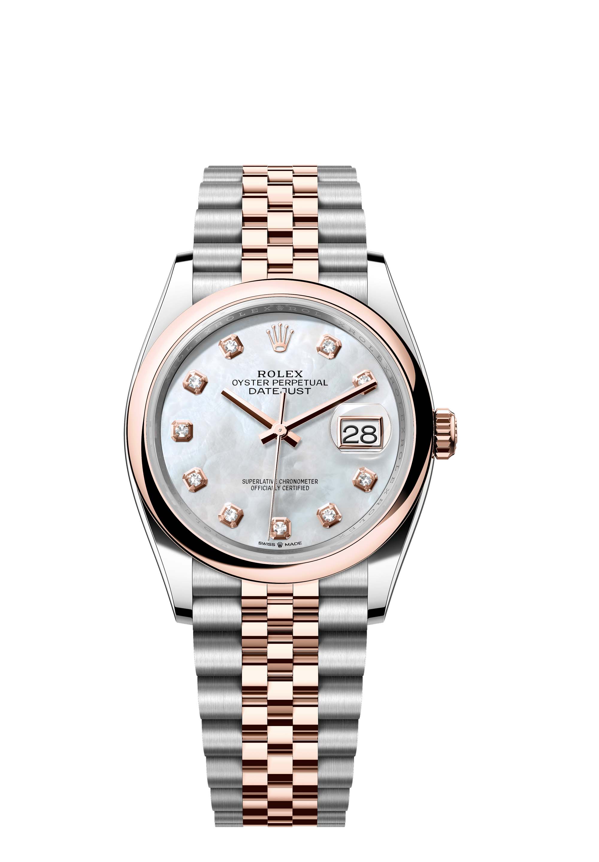 This Oyster Perpetual Datejust 36 in Oystersteel and Everose gold features a white mother-of-pearl, diamond-set dial and a Jubilee bracelet.