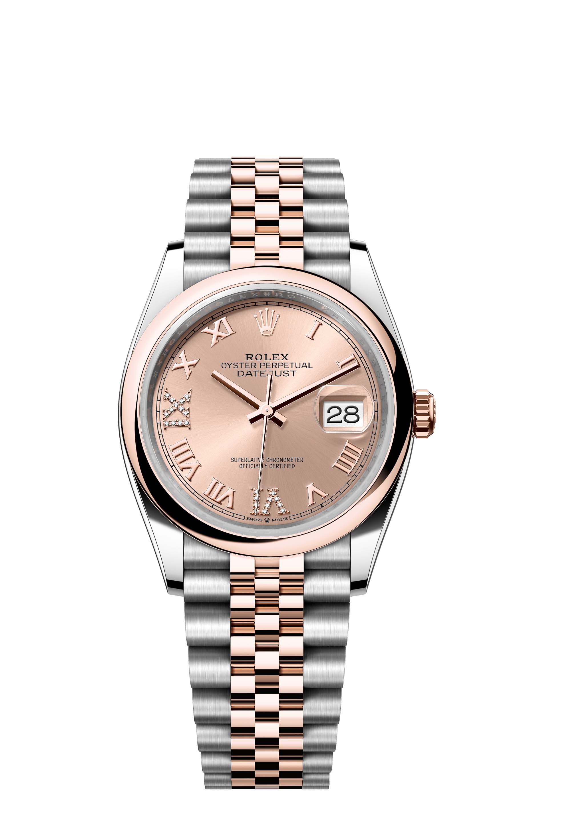 This Oyster Perpetual Datejust 36 in Oystersteel and Everose gold features a rosé colour, diamond-set dial and a Jubilee bracelet.