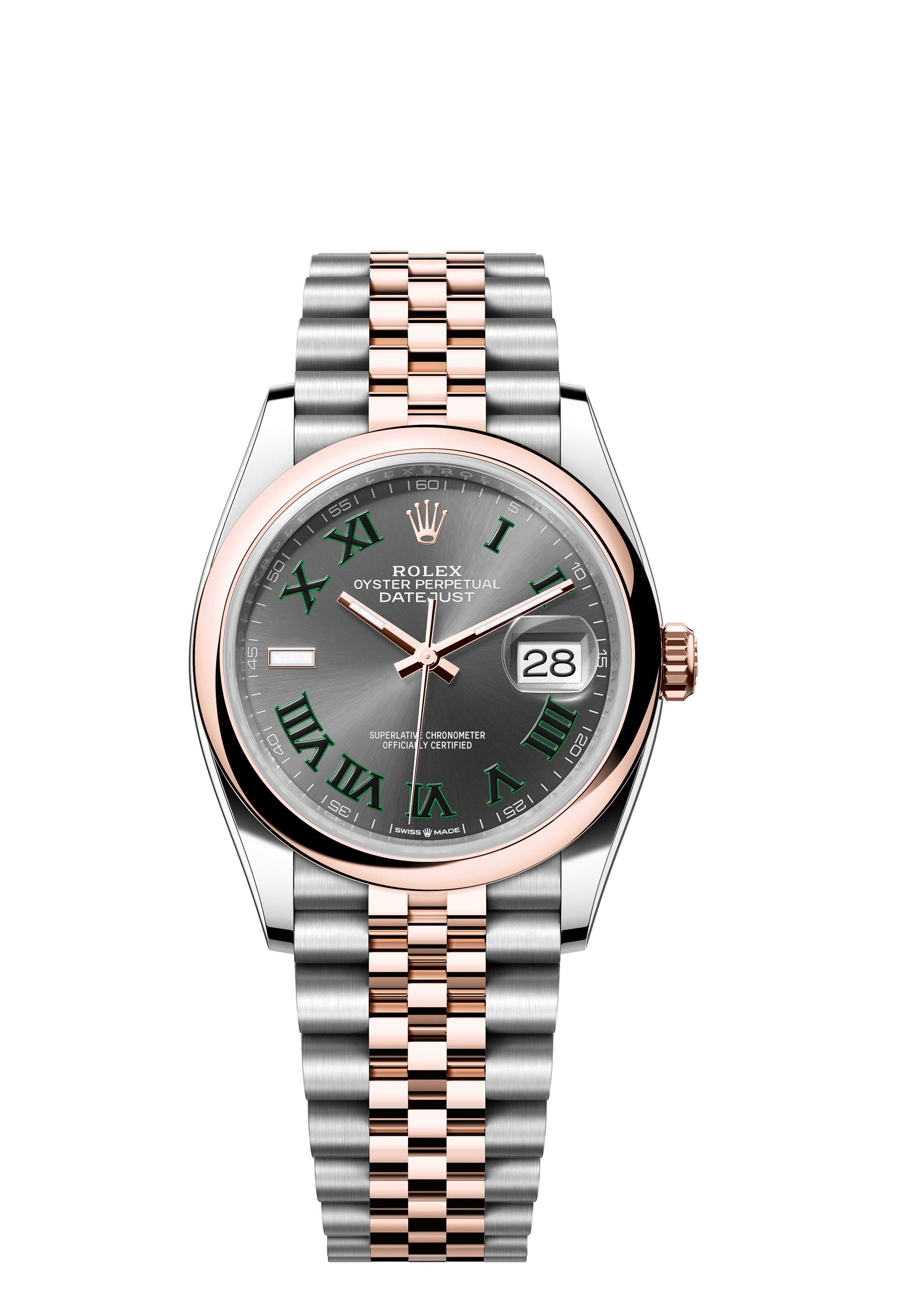 This Oyster Perpetual Datejust 36 in Oystersteel and Everose gold features a slate dial and a Jubilee bracelet.