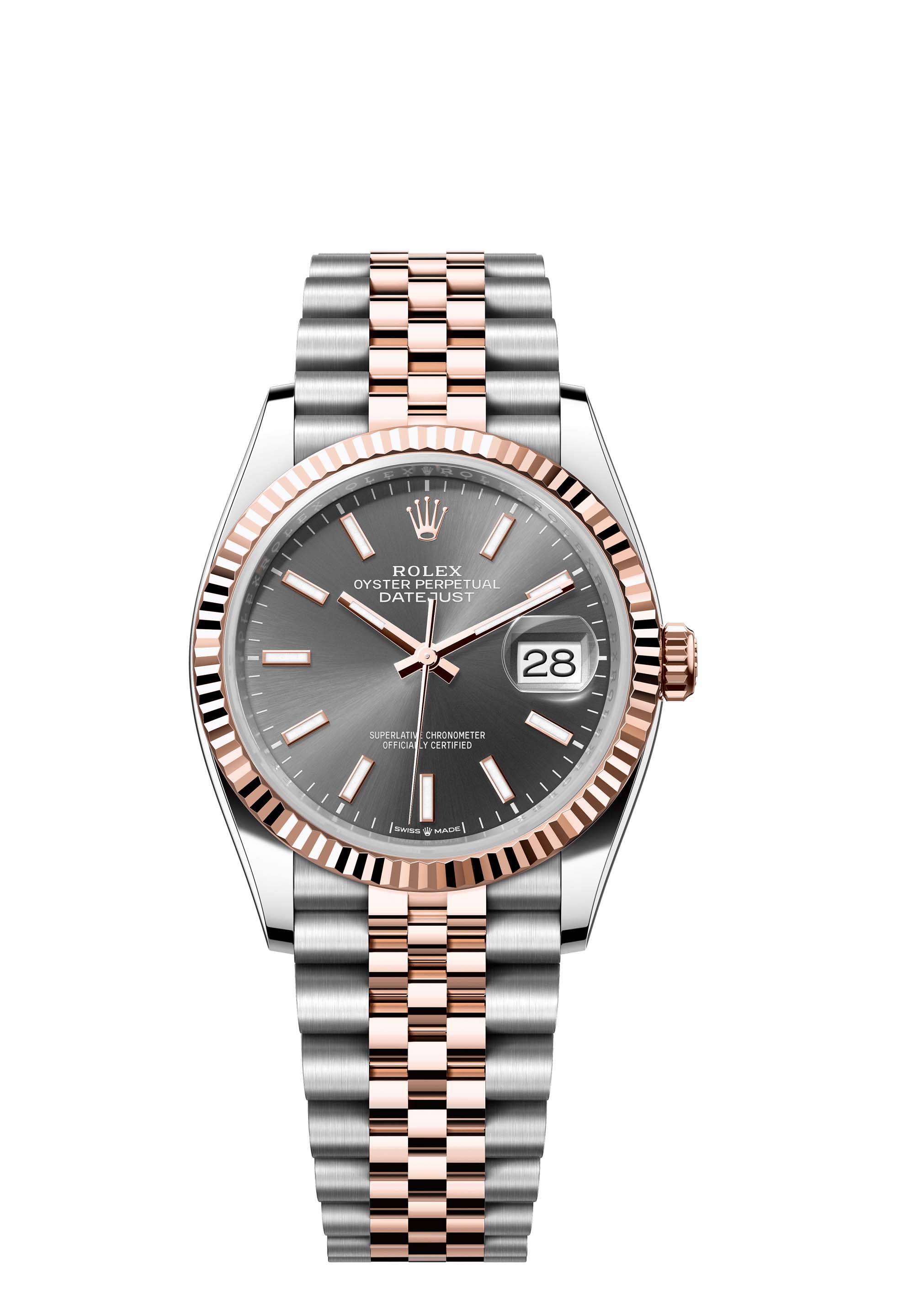 This Oyster Perpetual Datejust 36 in Oystersteel and Everose gold features a slate dial and a Jubilee bracelet.