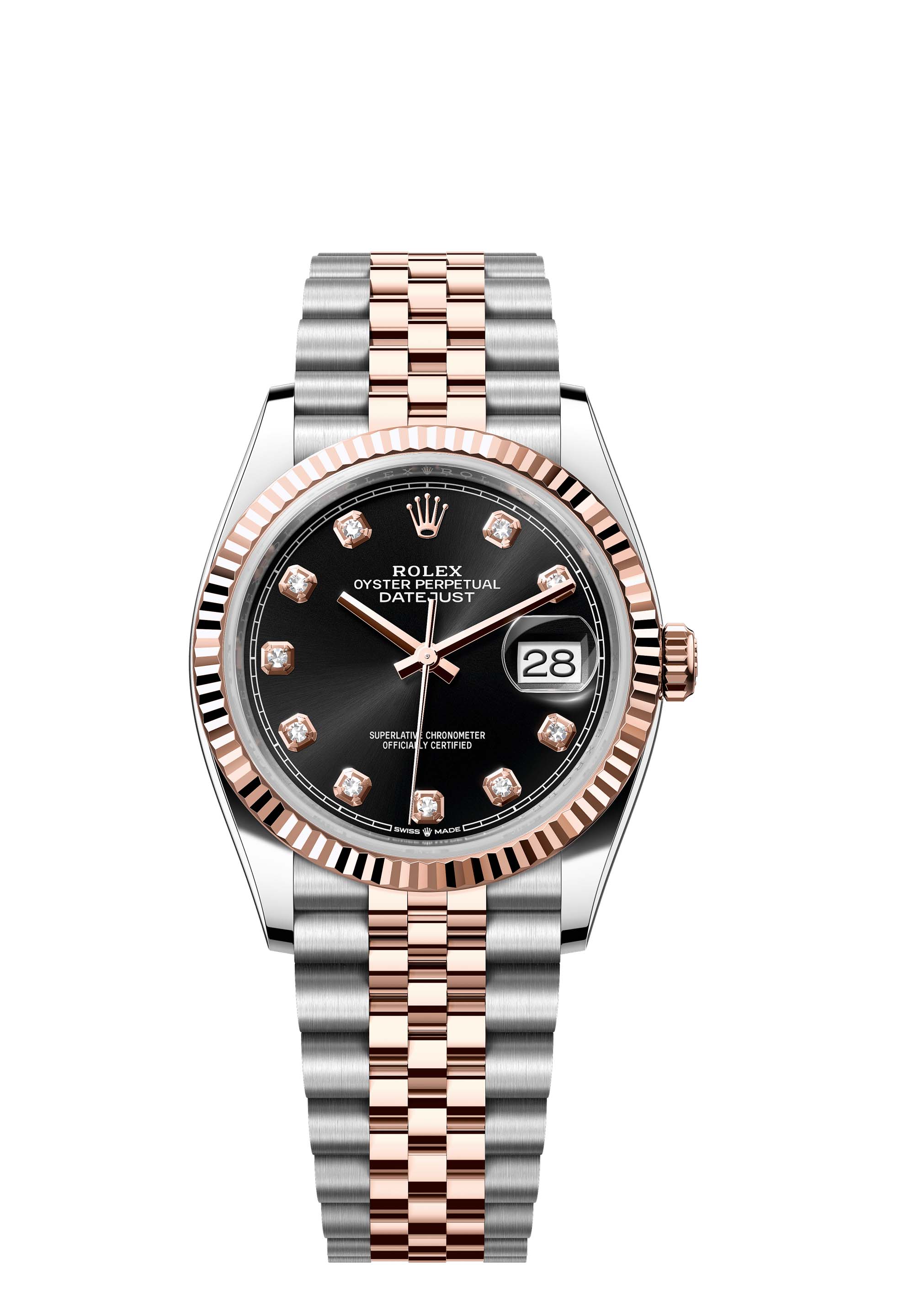 This Oyster Perpetual Datejust 36 in Oystersteel and Everose gold features a bright black, diamond-set dial and a Jubilee bracelet.
