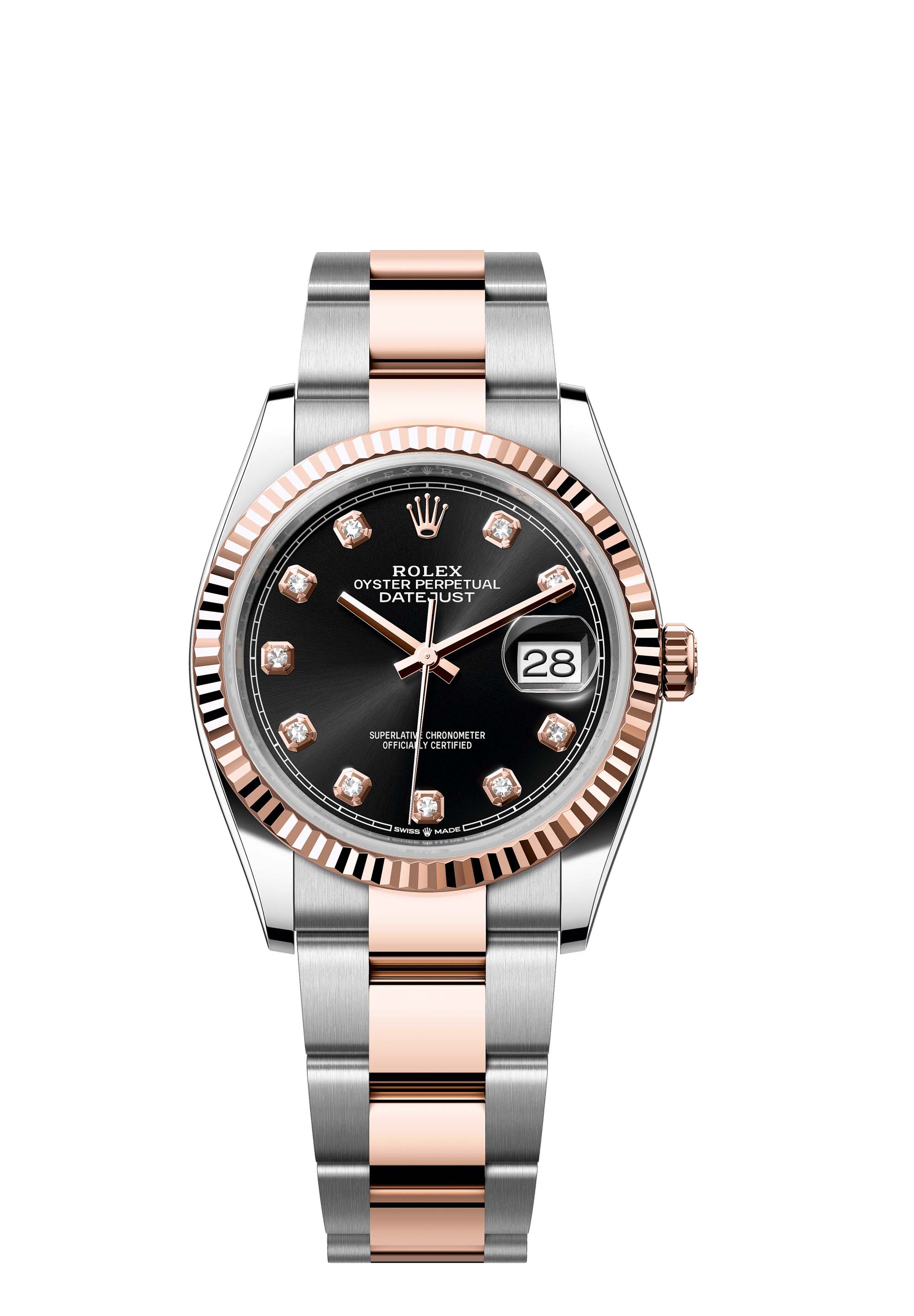 This Oyster Perpetual Datejust 36 in Oystersteel and Everose gold features a bright black, diamond-set dial and an Oyster bracelet.