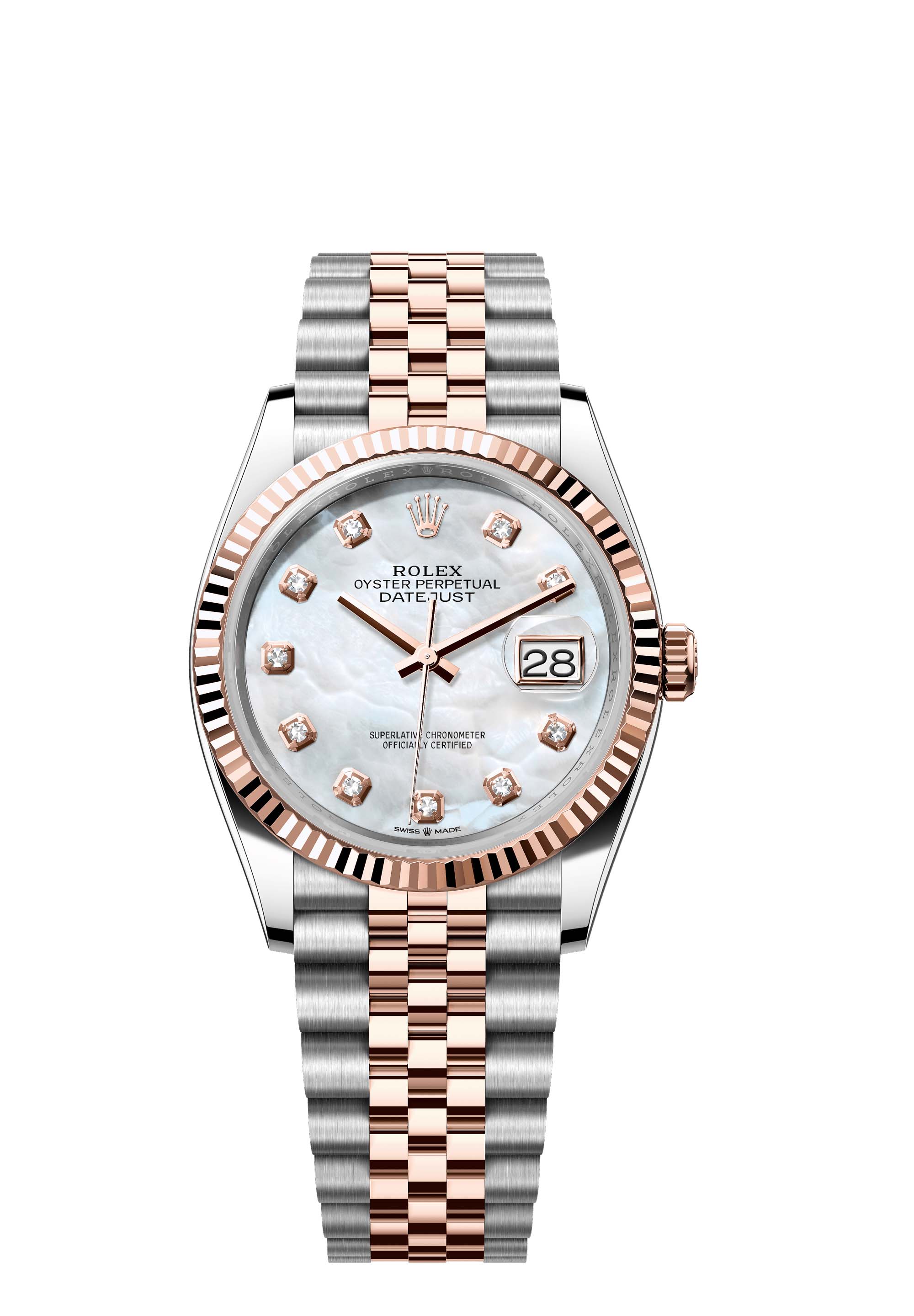 This Oyster Perpetual Datejust 36 in Oystersteel and Everose gold features a white mother-of-pearl, diamond-set dial and a Jubilee bracelet.