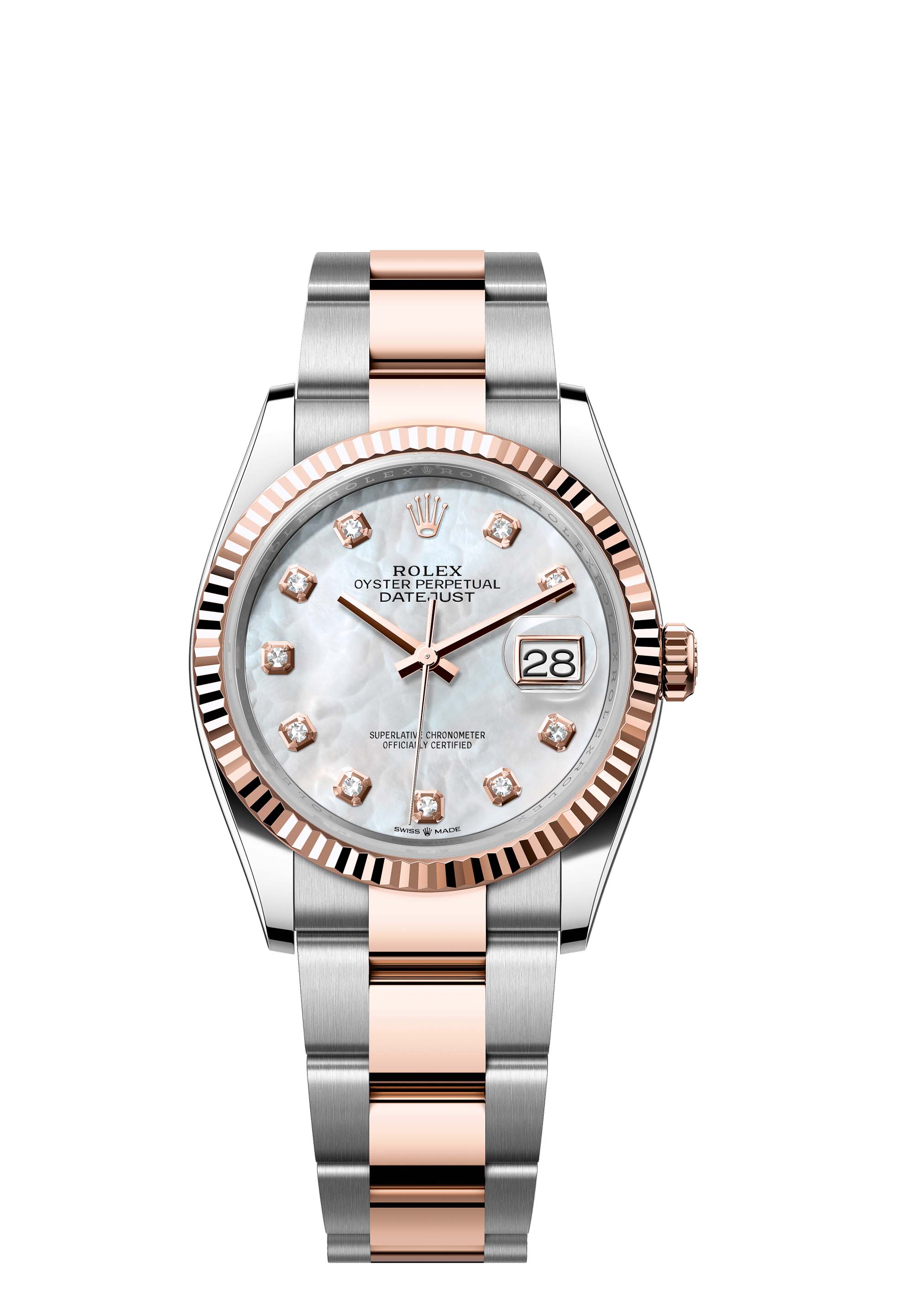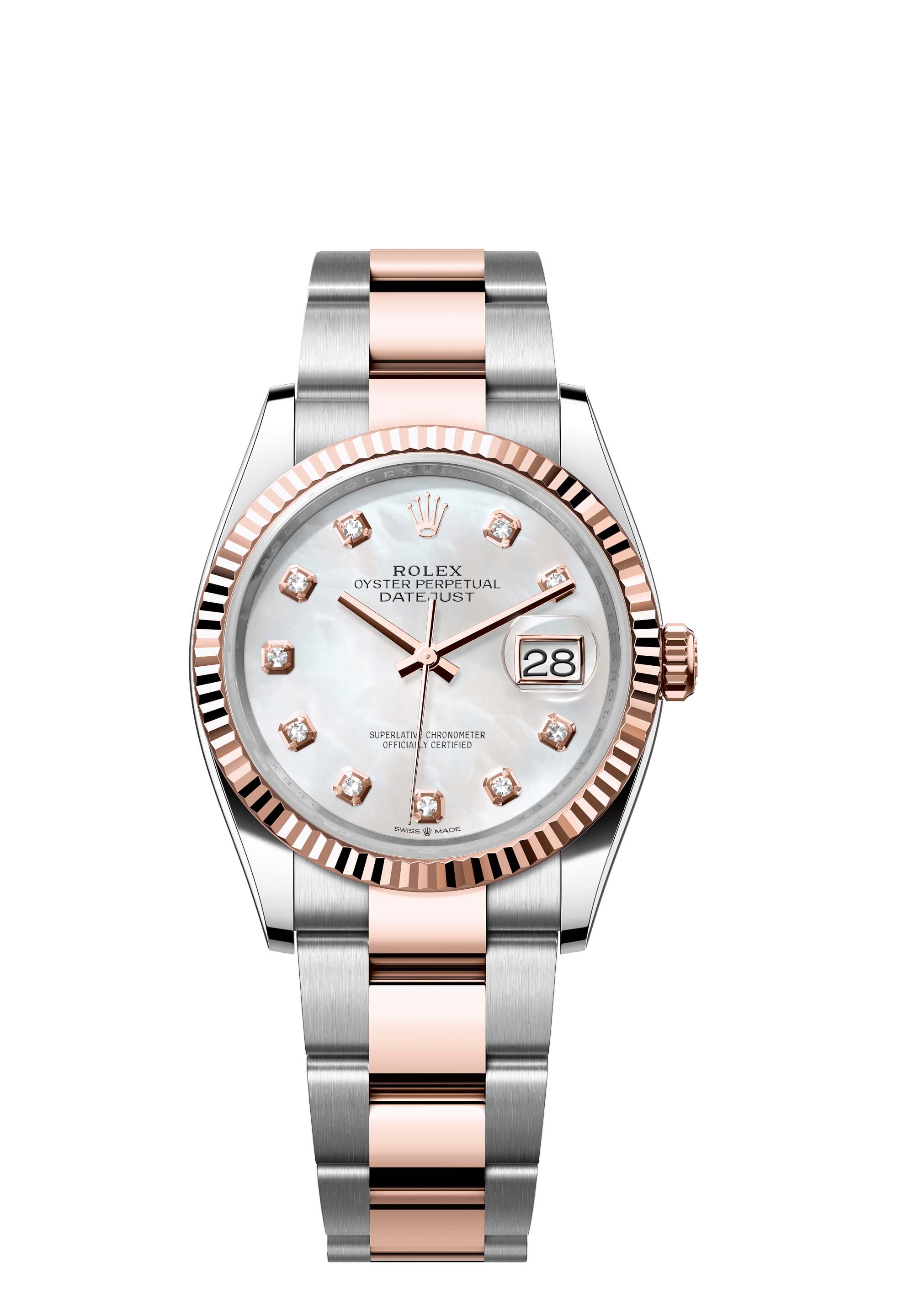 This Oyster Perpetual Datejust 36 in Oystersteel and Everose gold features a white mother-of-pearl, diamond-set dial and an Oyster bracelet.
