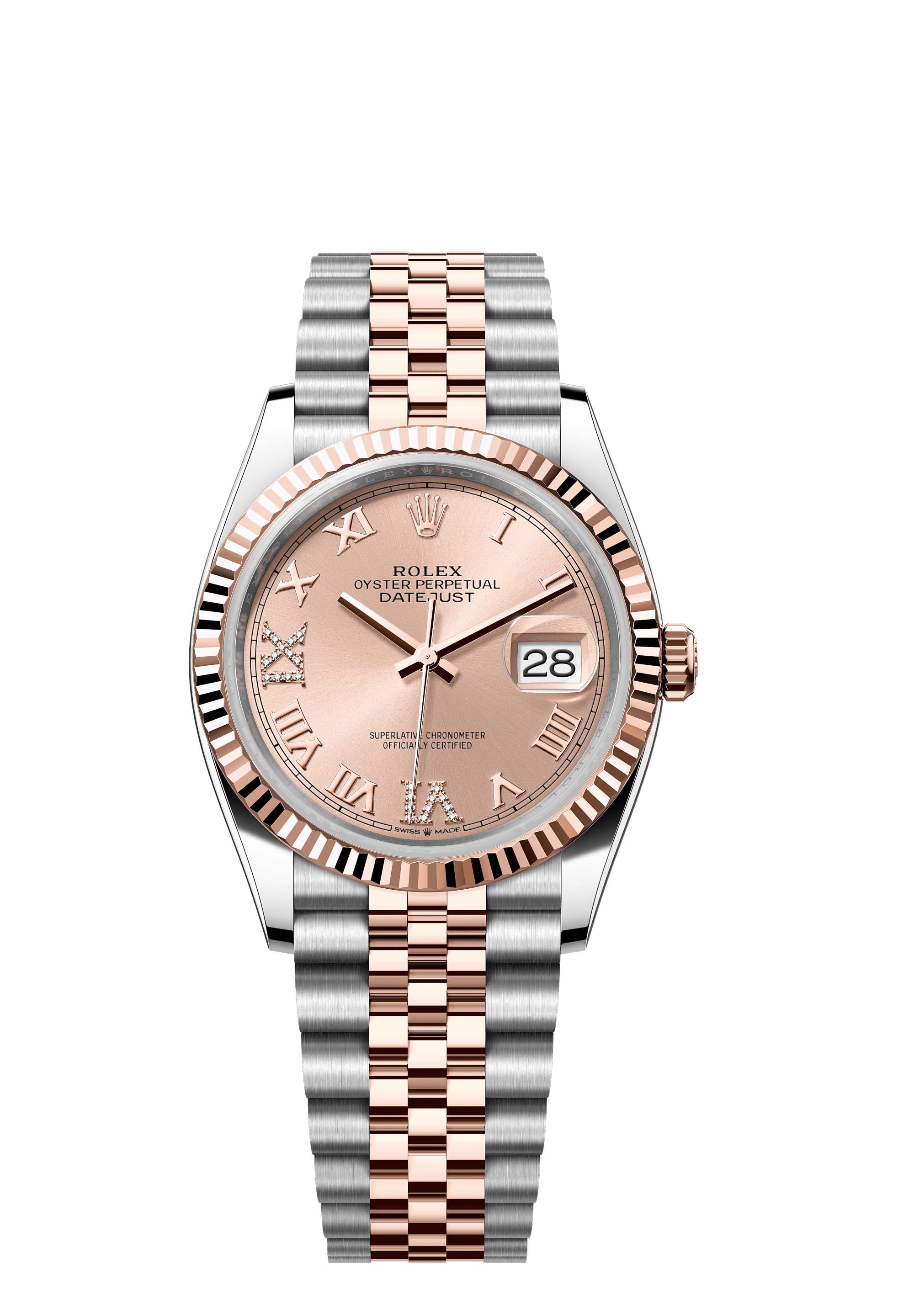 This Oyster Perpetual Datejust 36 in Oystersteel and Everose gold features a rosé colour, diamond-set dial and a Jubilee bracelet.