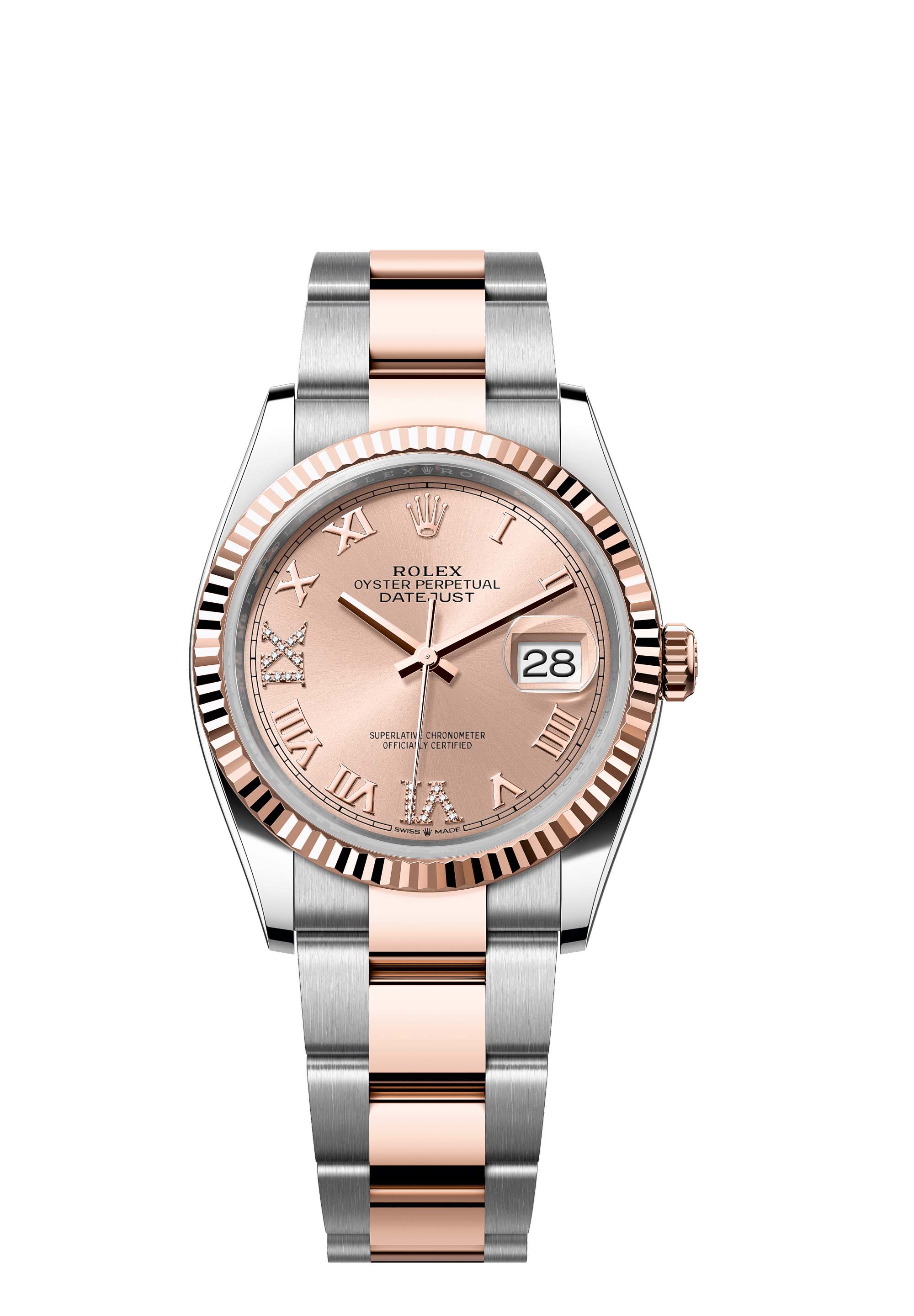 This Oyster Perpetual Datejust 36 in Oystersteel and Everose gold features a rosé colour, diamond-set dial and an Oyster bracelet.