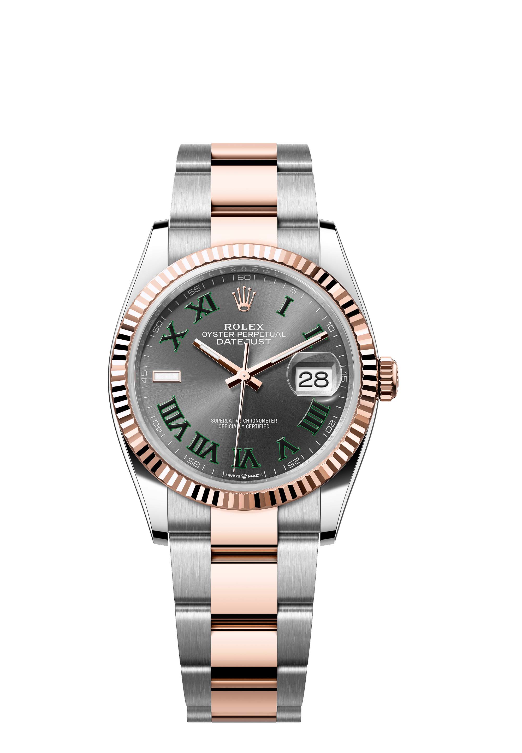 This Oyster Perpetual Datejust 36 in Oystersteel and Everose gold features a slate dial and an Oyster bracelet.