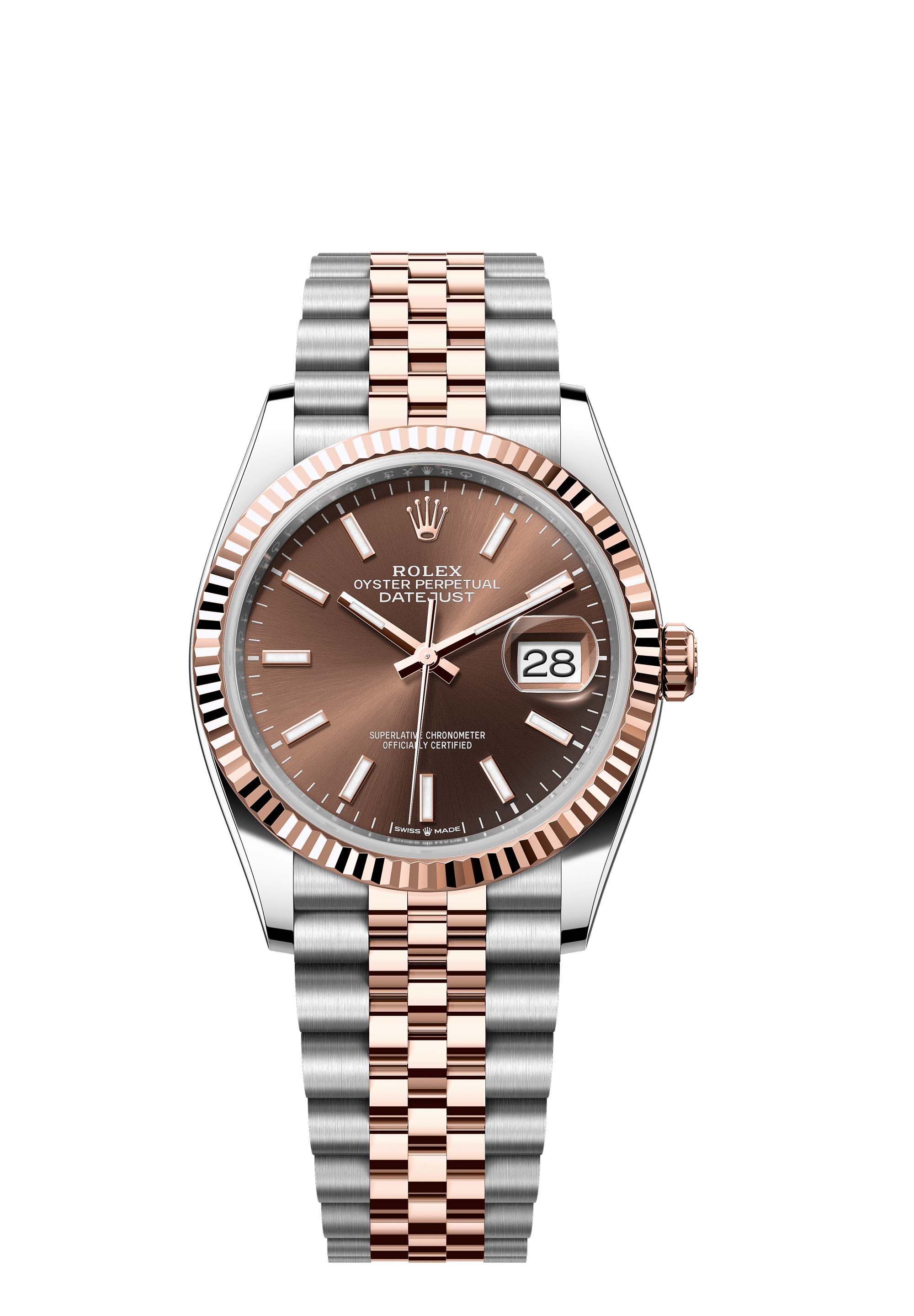 This Oyster Perpetual Datejust 36 in Oystersteel and Everose gold features a chocolate dial and a Jubilee bracelet.