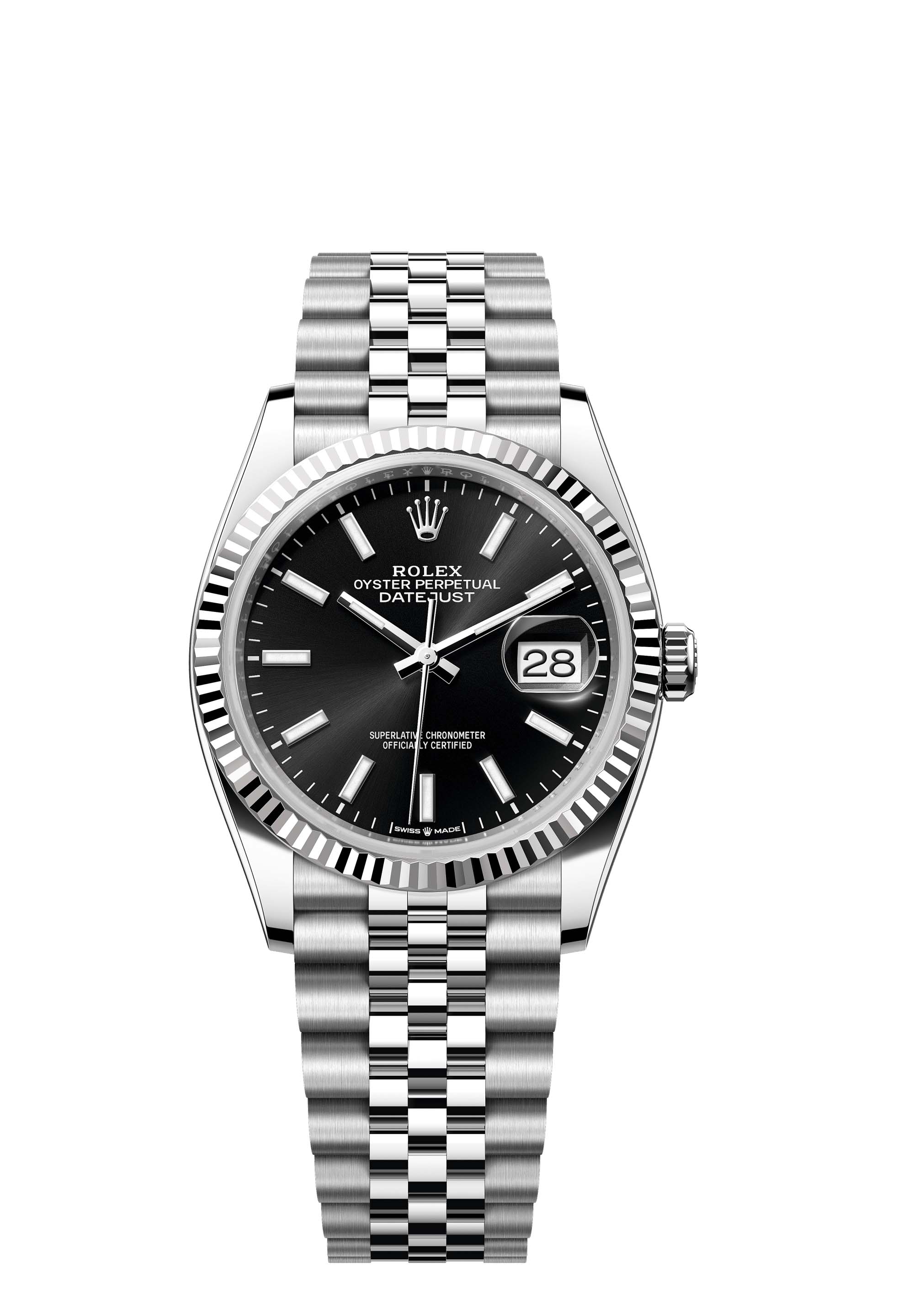 This Oyster Perpetual Datejust 36 in Oystersteel and white gold features a bright black dial and a Jubilee bracelet.