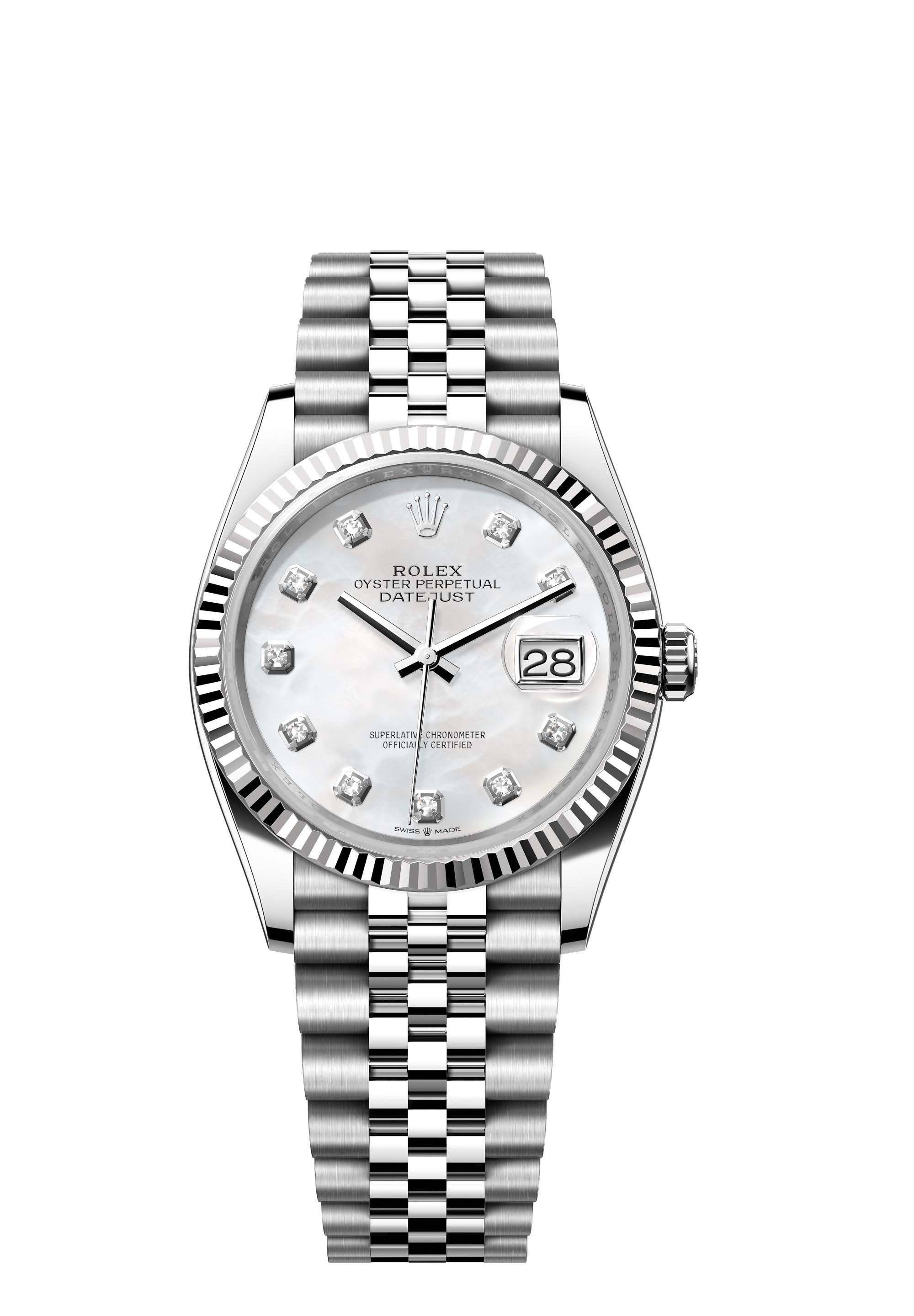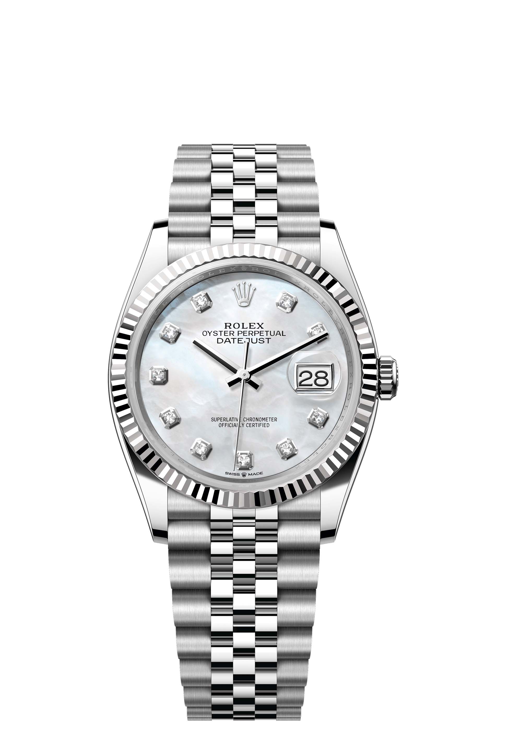 This Oyster Perpetual Datejust 36 in Oystersteel and white gold features a white mother-of-pearl, diamond-set dial and a Jubilee bracelet.