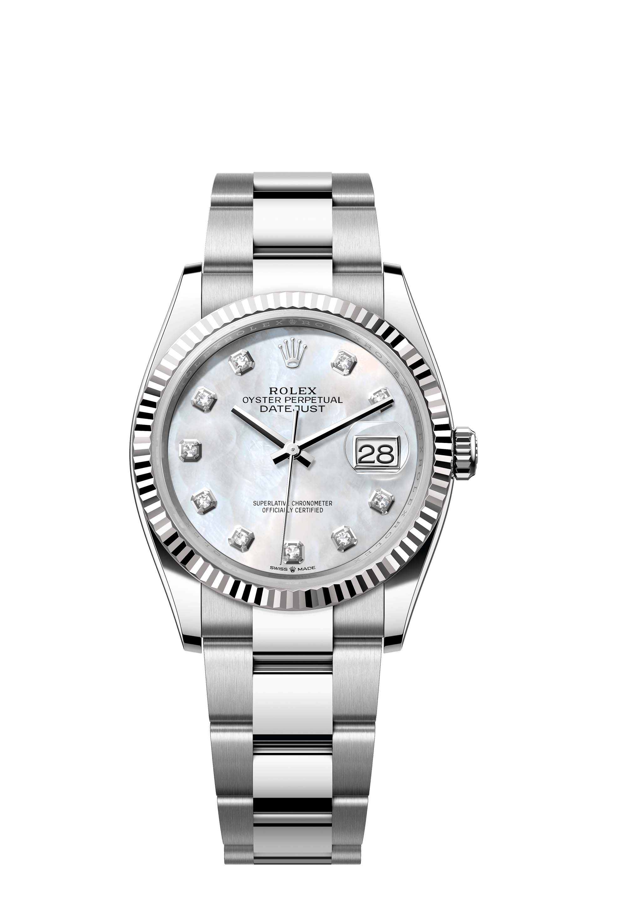 This Oyster Perpetual Datejust 36 in Oystersteel and white gold features a white mother-of-pearl, diamond-set dial and an Oyster bracelet.