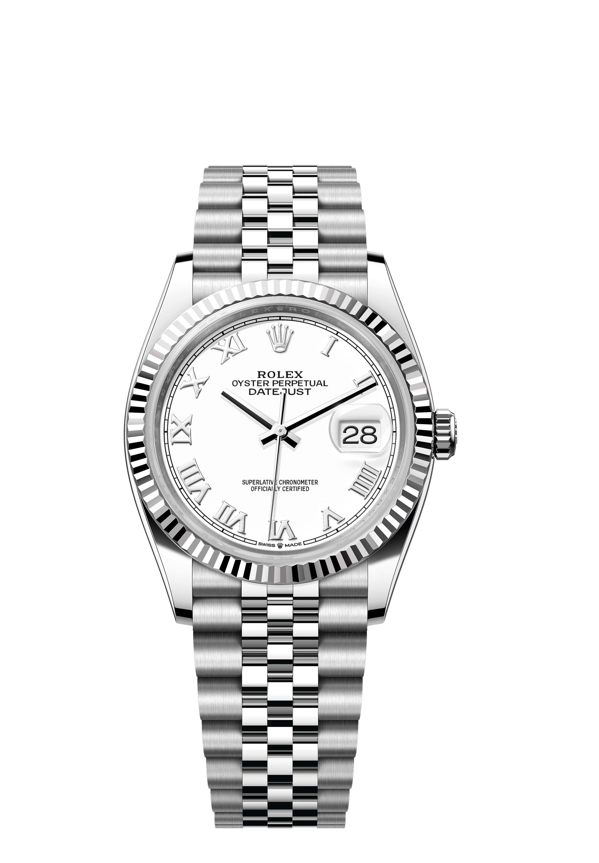 This Oyster Perpetual Datejust 36 in Oystersteel and white gold features a white dial and a Jubilee bracelet.