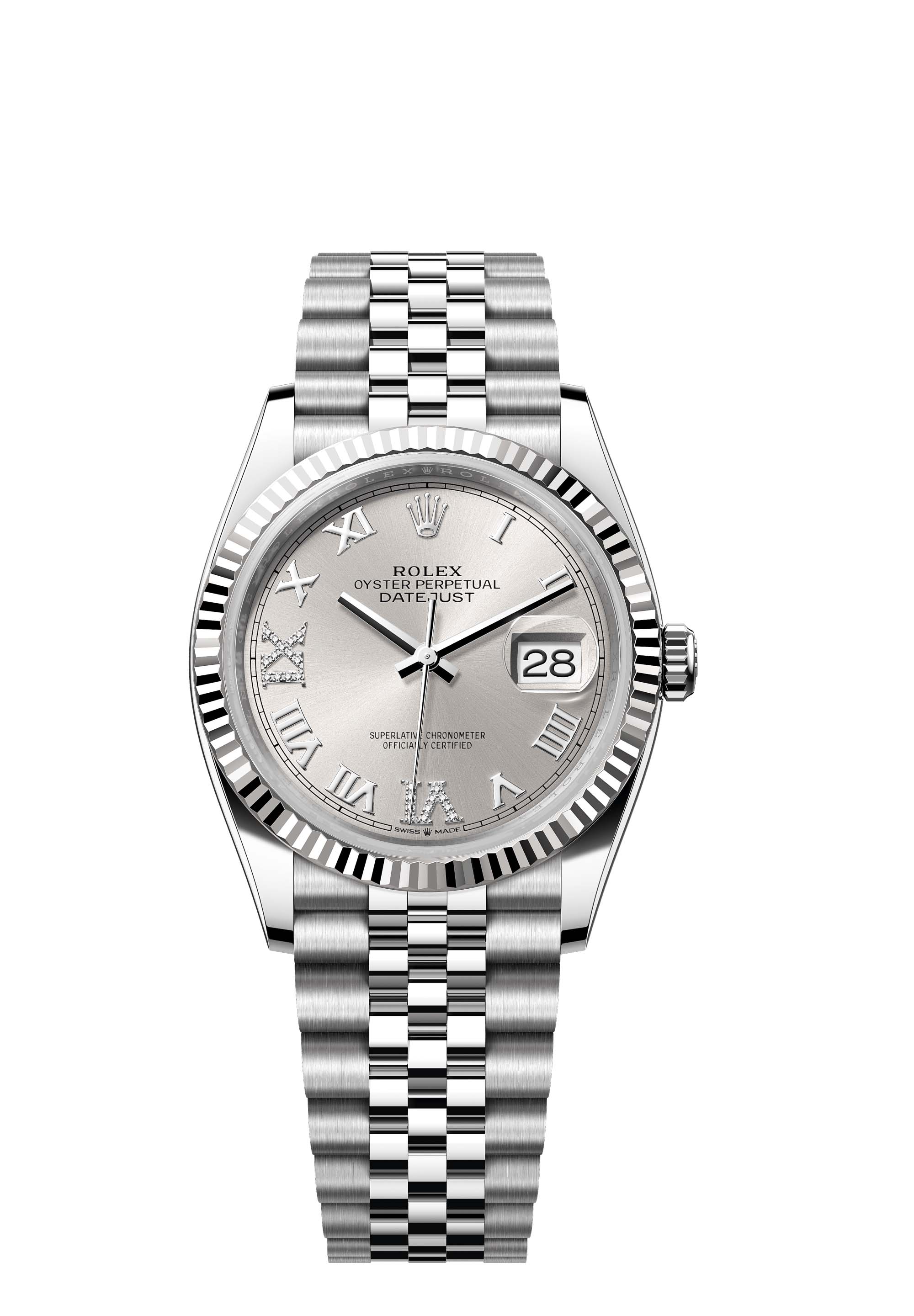 This Oyster Perpetual Datejust 36 in Oystersteel and white gold features a silver, diamond-set dial and a Jubilee bracelet.