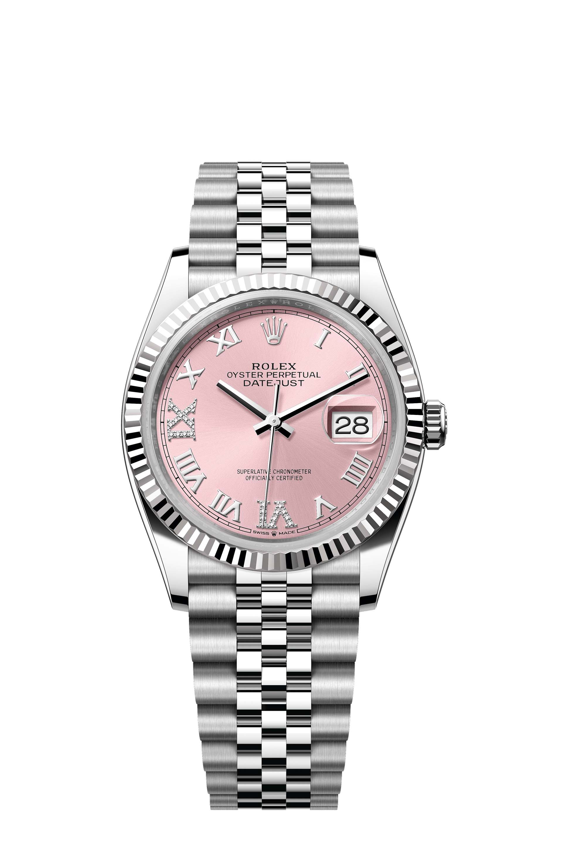 This Oyster Perpetual Datejust 36 in Oystersteel and white gold features a pink, diamond-set dial and a Jubilee bracelet.