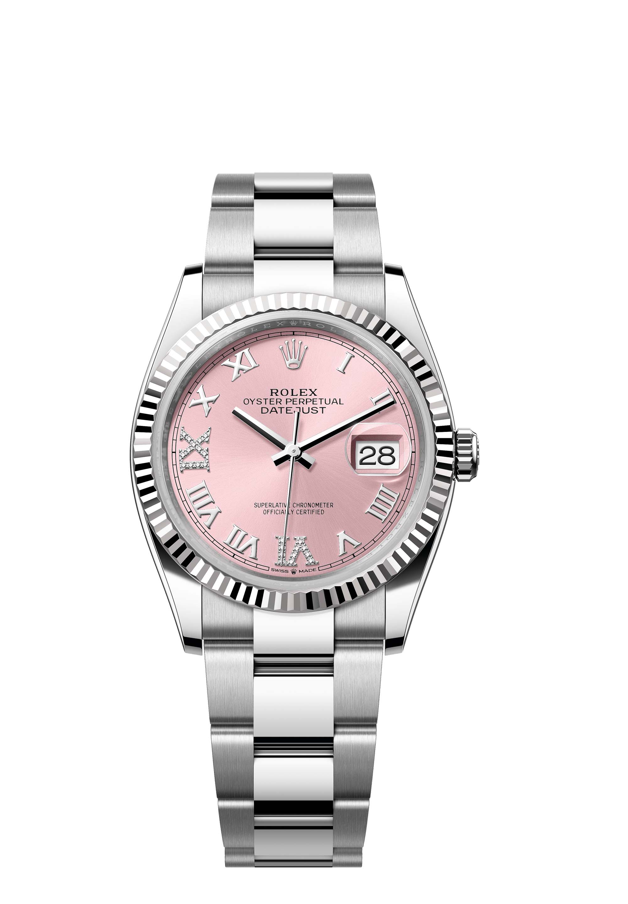 This Oyster Perpetual Datejust 36 in Oystersteel and white gold features a pink, diamond-set dial and an Oyster bracelet.