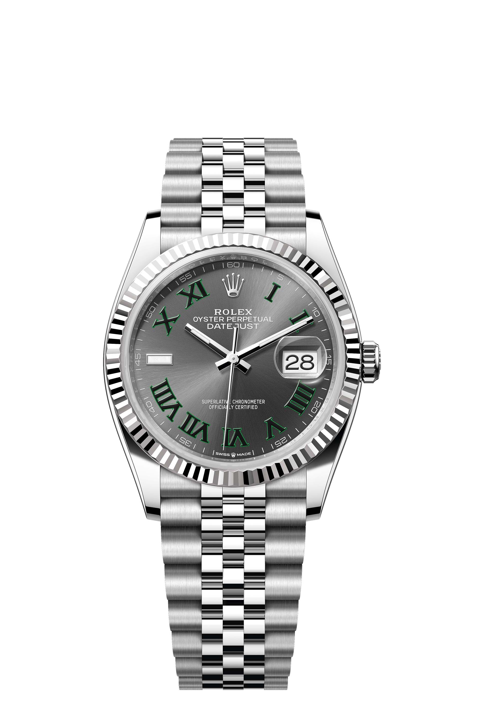 This Oyster Perpetual Datejust 36 in Oystersteel and white gold features a slate dial and a Jubilee bracelet.