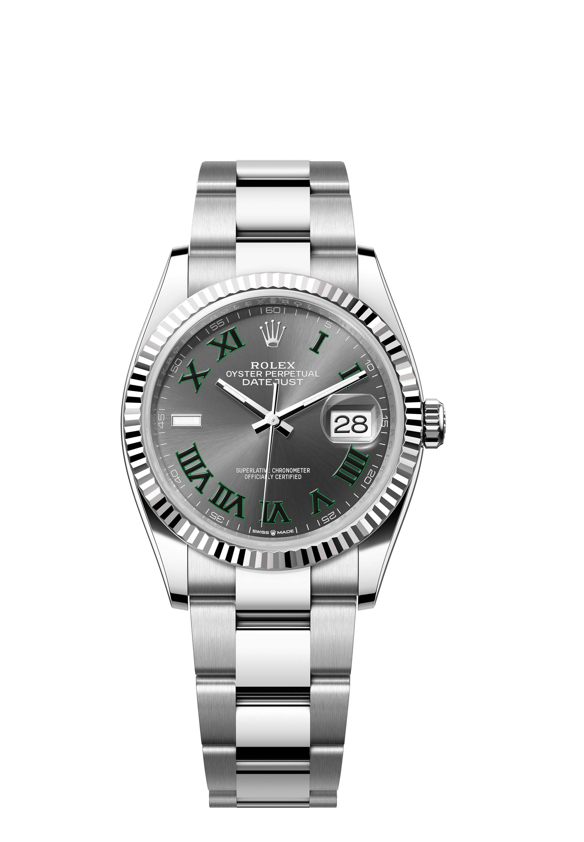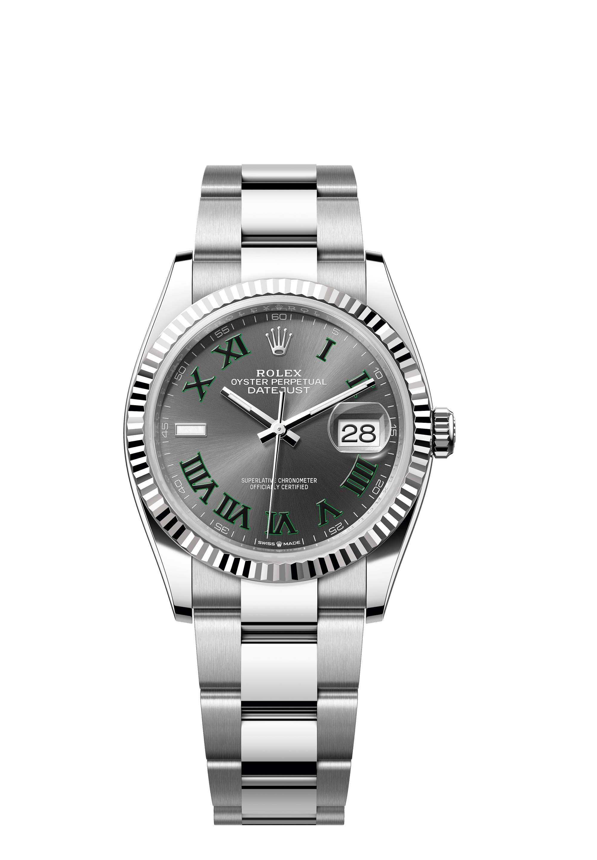 This Oyster Perpetual Datejust 36 in Oystersteel and white gold features a slate dial and an Oyster bracelet.