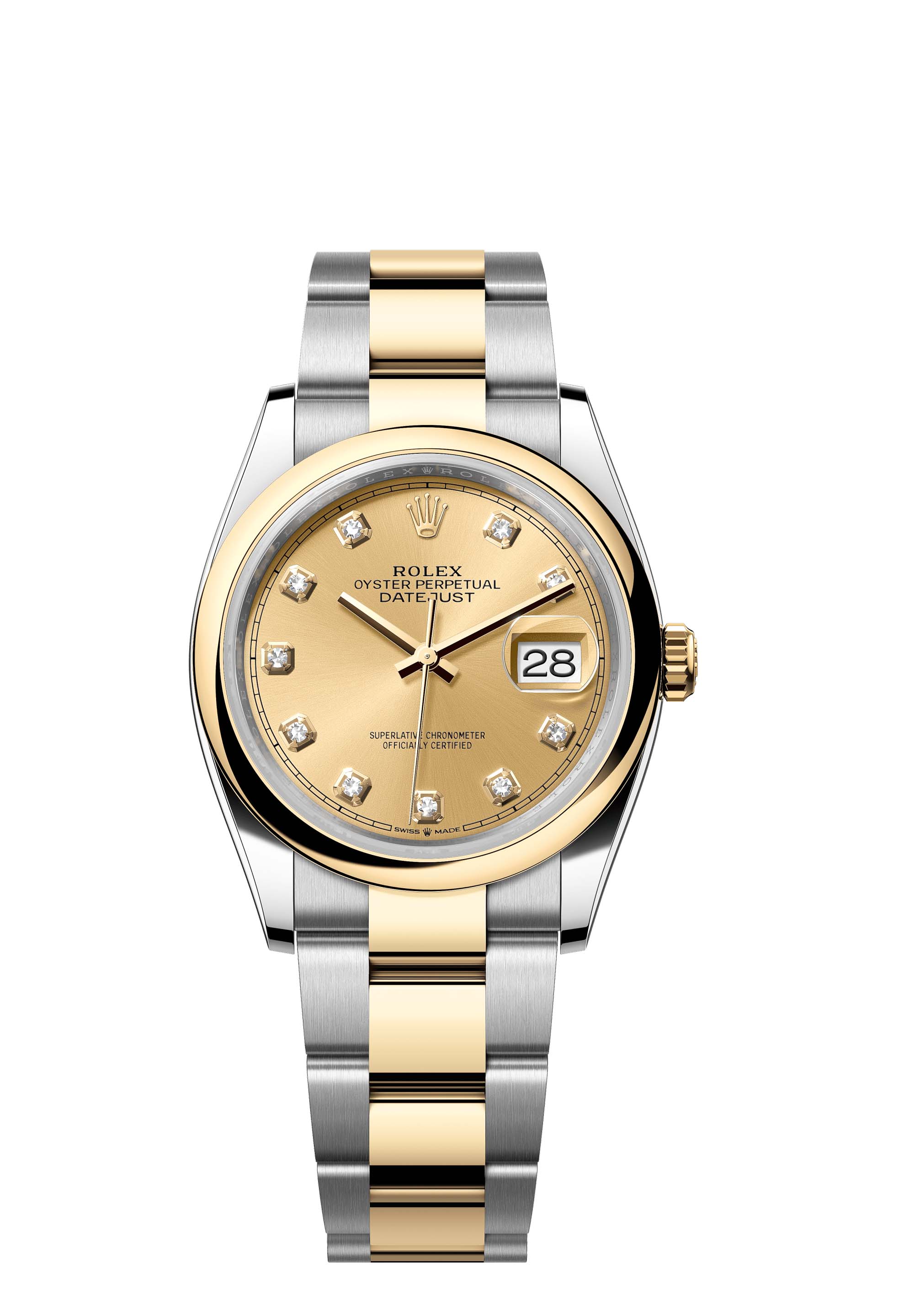 This Oyster Perpetual Datejust 36 in Oystersteel and yellow gold features a champagne colour, diamond-set dial and an Oyster bracelet.
