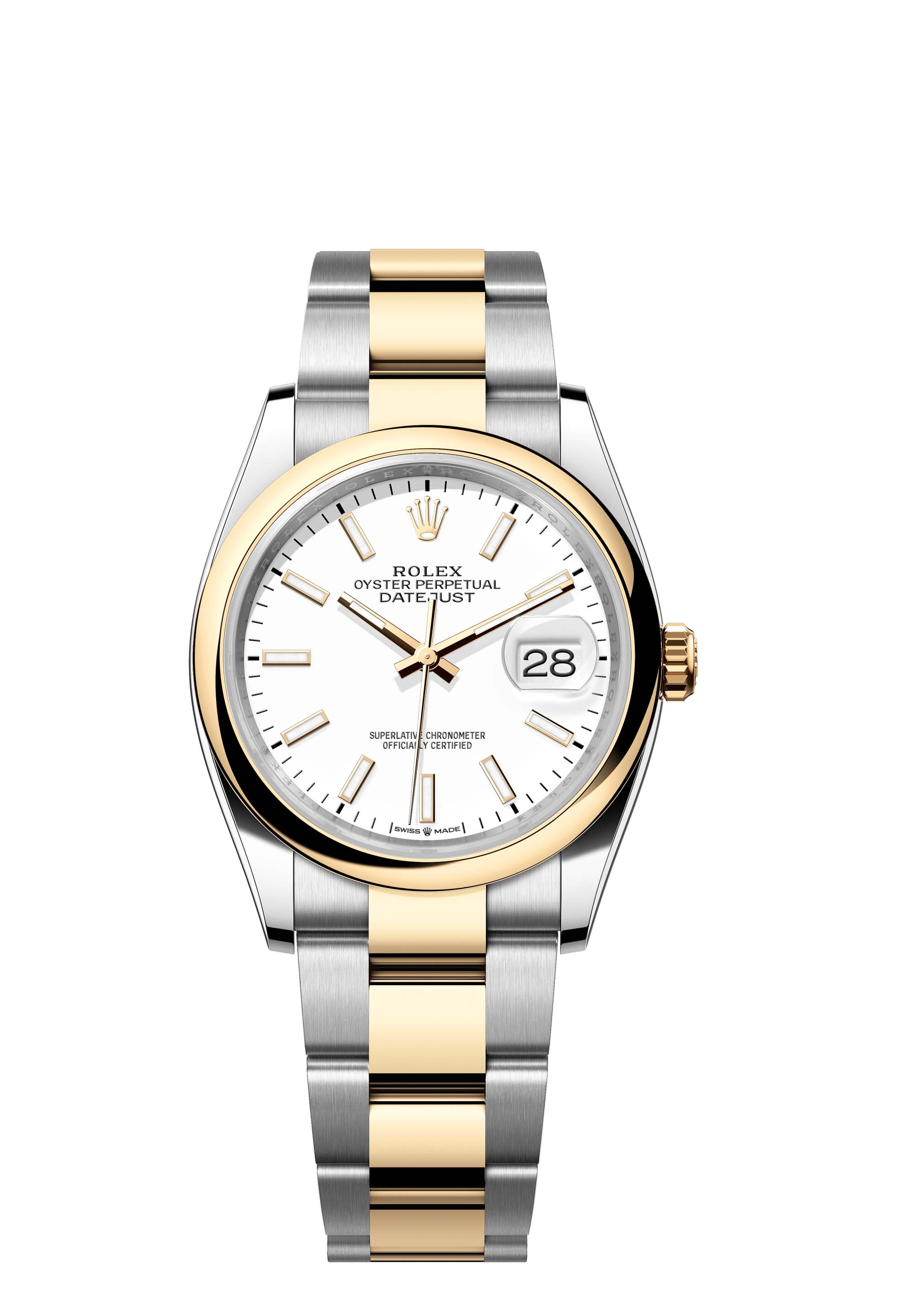 This Oyster Perpetual Datejust 36 in Oystersteel and yellow gold features a white dial and an Oyster bracelet.